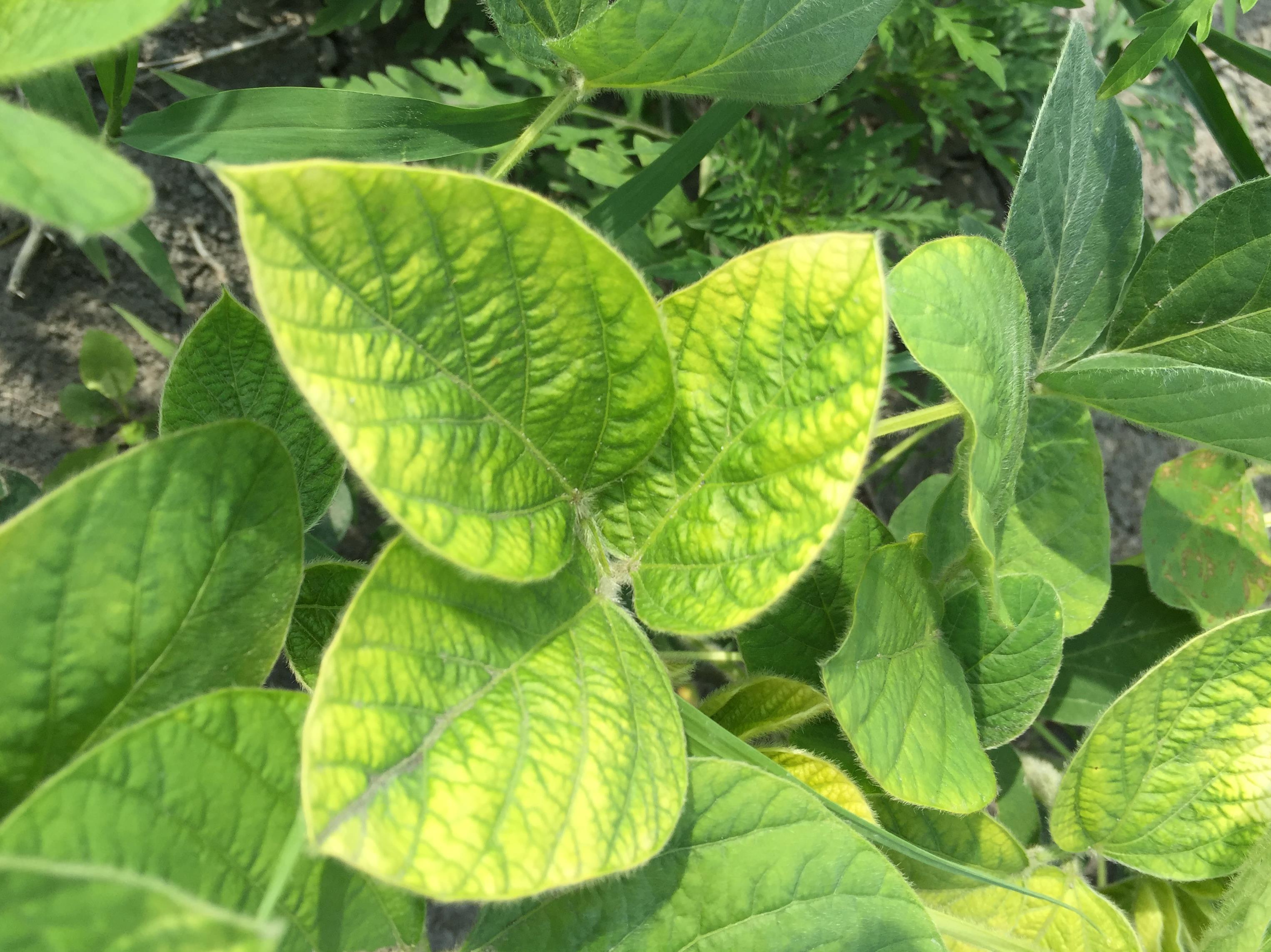Description: La feuille terminale d'un plant de soya montre un jaunissement à blanchiment des tissus. La décoloration est attribuable à l’application de CALLISTO® 480SC (mésotrione), à 30% de la dose recommandée, dans la parcelle (de démonstration) de soya RR. Typiquement, les plantes sensibles à la mésotrione présentent un blanchiment (ou un jaunissement) internervaire, suivi d’une nécrose des tissus. L’application de la mésotrione dans un soya ne tolérant pas l’herbicide peut occasionner d’importants dommages à la culture, des pertes de rendement voire la mort de la culture.