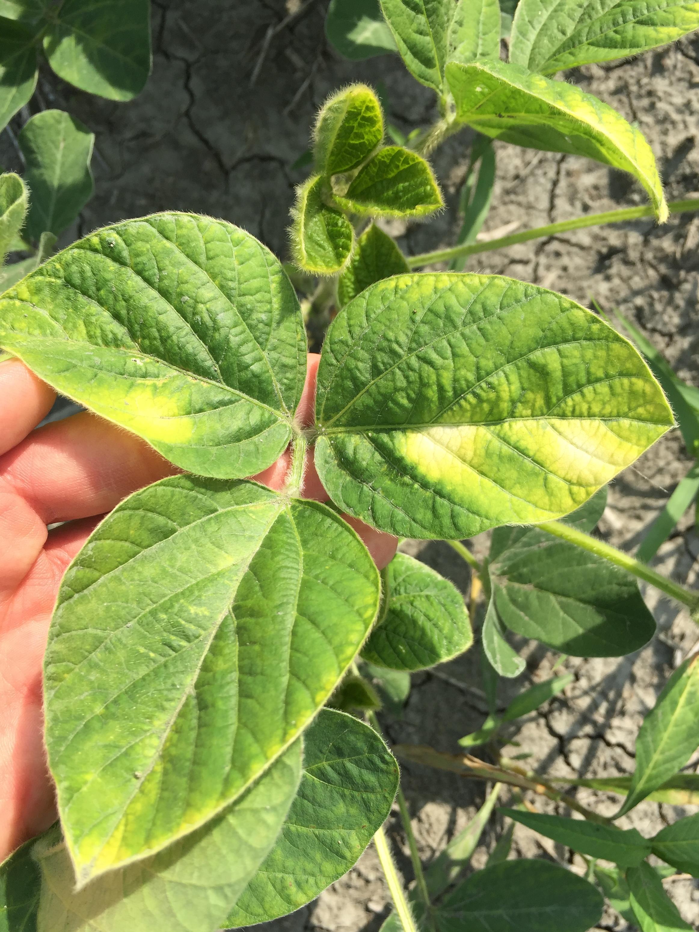 Description: Les feuilles terminales du soya montrent un jaunissement à blanchiment des tissus. Cette décoloration est attribuable à l’application de CALLISTO® 480SC (mésotrione), à 30% de la dose recommandée, dans la parcelle (de démonstration) de soya RR. Typiquement, les plantes sensibles à la mésotrione présentent un blanchiment (ou un jaunissement) internervaire, suivi d’une nécrose des tissus. L’application de la mésotrione dans un soya ne tolérant pas l’herbicide peut occasionner d’importants dommages à la culture, des pertes de rendement voire la mort de la culture.