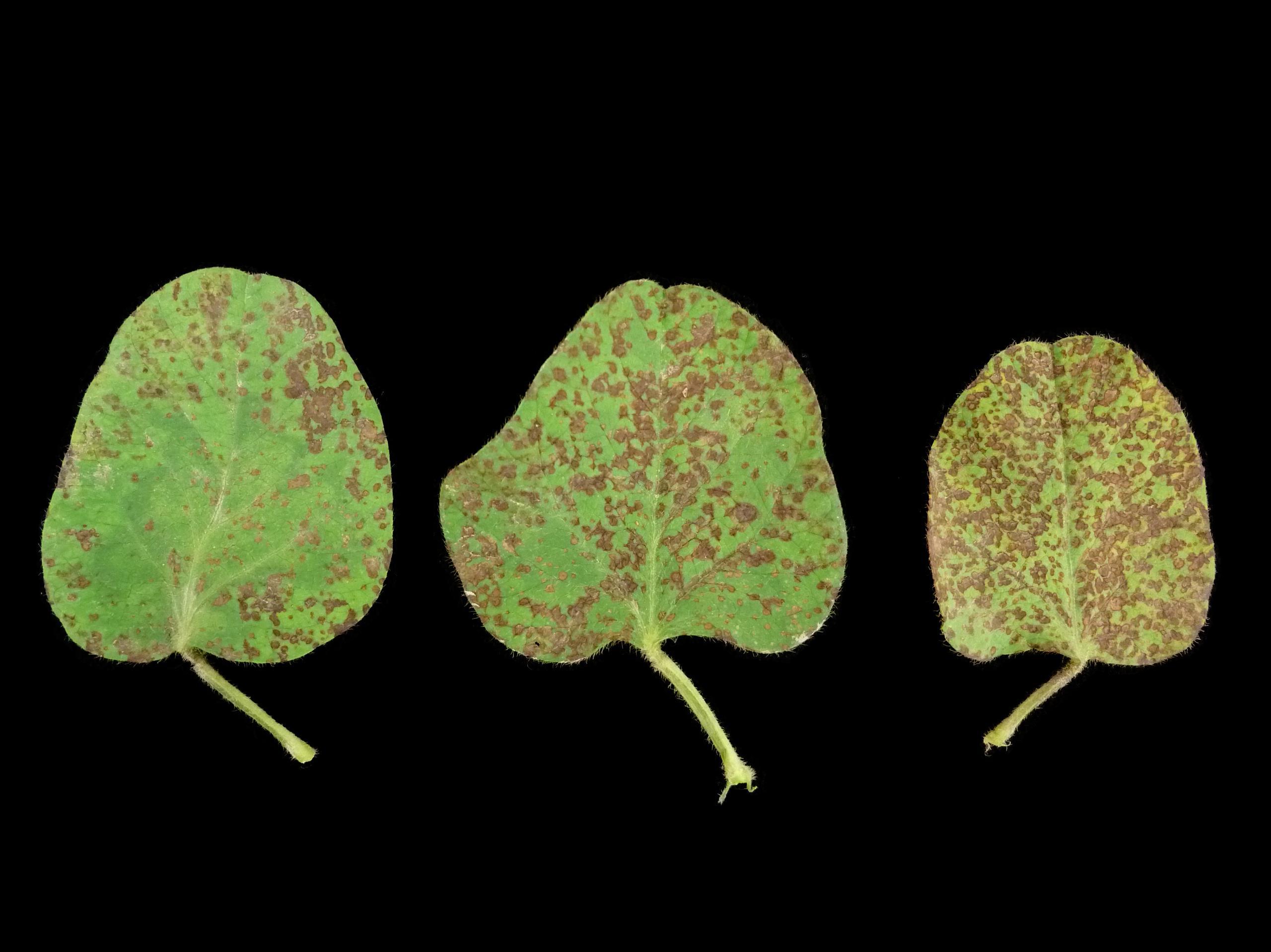 Légende: Folioles de soya avec taches rougeâtres à brunâtres