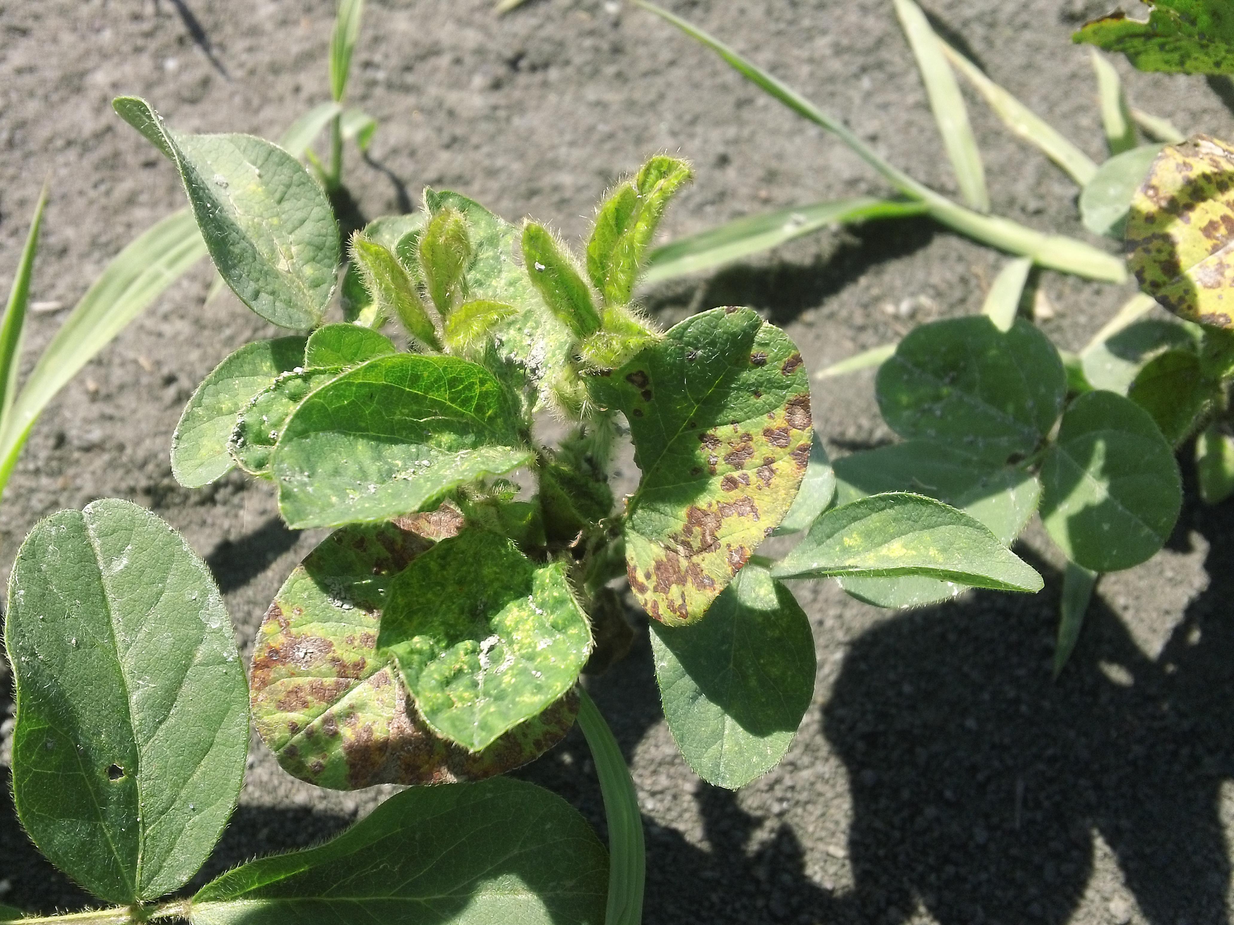 Description: Les feuilles médianes d’un plant de soya présentent de petites taches plus ou moins circulaires et brunâtres. Les dommages observés sont apparus suite à l’application du AIMMD EC (carfentrazone-éthyl), en postlevée de la culture du soya, à une dose de 0,01 L/ha (essai réalisé au champ pour simuler une dérive). L’herbicide AIM en est un de contact, utilisé comme traitement de brûlage en pré-semis ou comme aide à la récolte. Cet herbicide est absorbé rapidement par les feuilles des plantes (via le phloème). Dans les quelques heures suivant le traitement, les feuilles des plantes sensibles se dessèchent; il y a nécrose des tissus et mort de la plante dans les jours qui suivent.