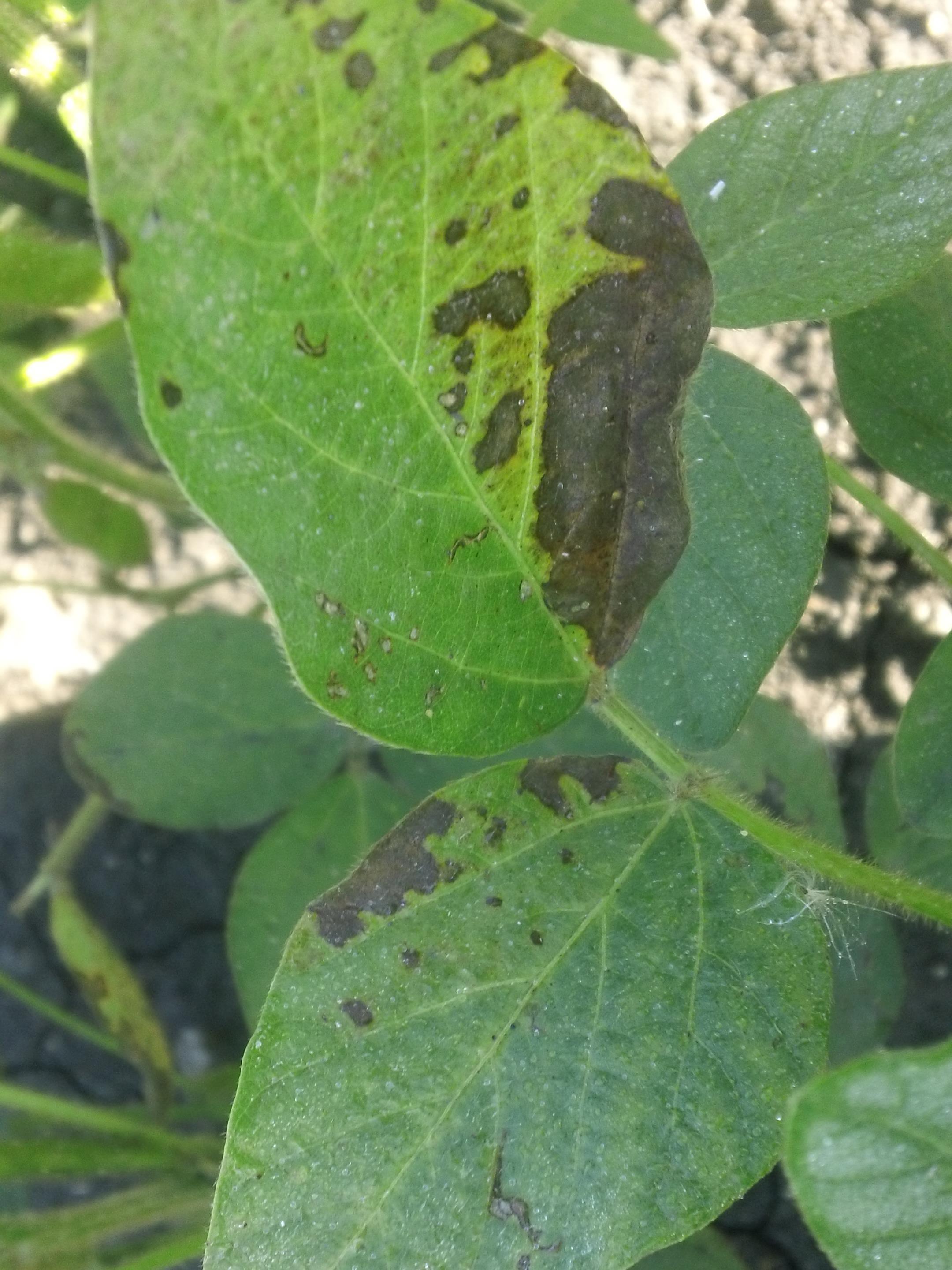 Description: Une feuille de soya montre des brûlures résultant de l’application en prélevée de SENCOR® 75 DF (métribuzine), à 200% de la dose recommandée à l’étiquette. Augmenter la dose d’herbicide appliqué, ici la métribuzine, peut causer des brûlures, un jaunissement ou un rabougrissement de la culture. De fortes pluies survenant peu de temps après le traitement, peuvent endommager la culture, particulièrement dans les zones mal égouttées où l’eau peut rester pendant plusieurs jours.