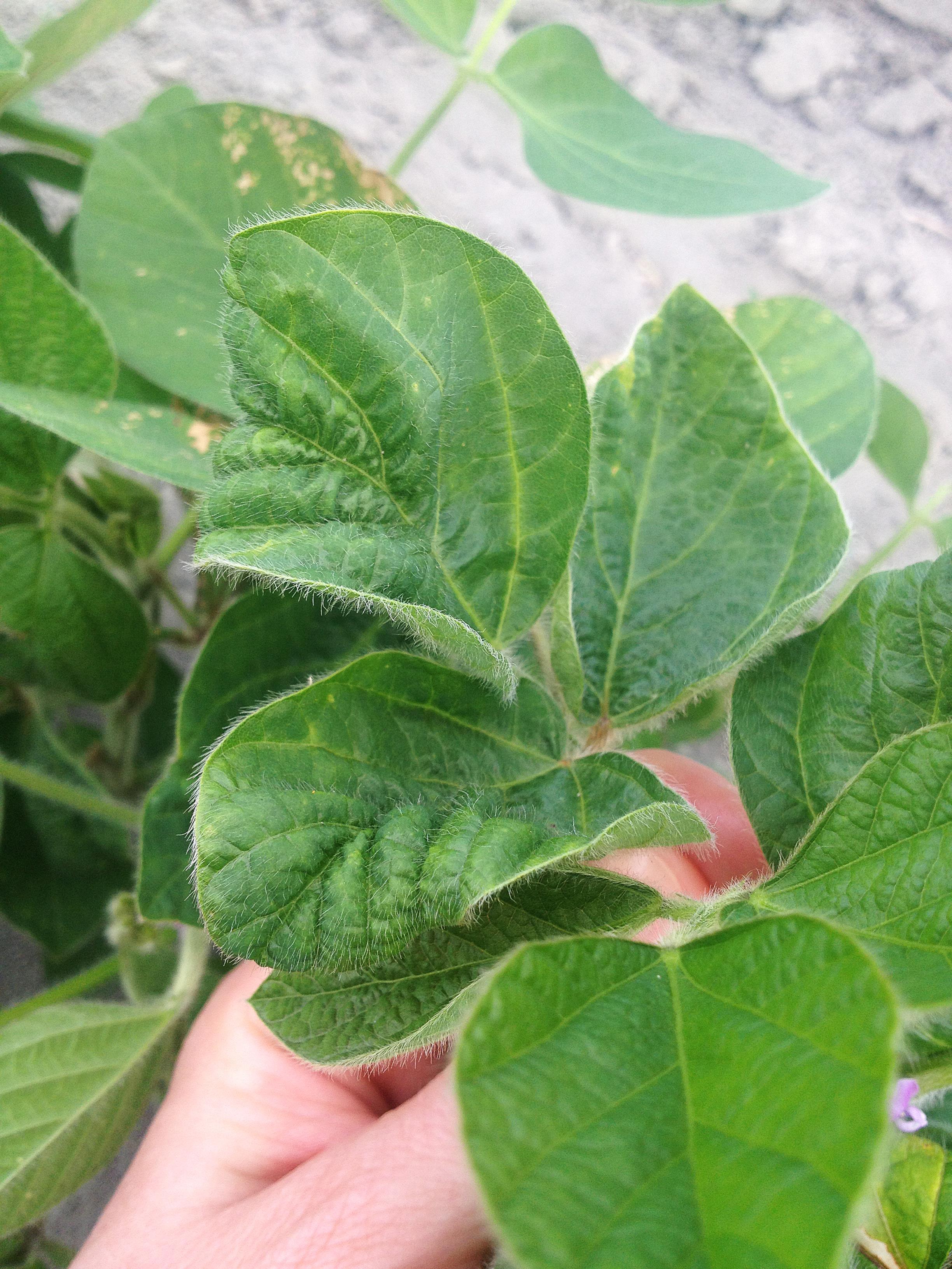 Description: La feuille d’un plant de soya présente un aspect plissé, causé par un pinçage de l’apex. Cette anomalie est apparue suite à l’application du FRONTIERMDMAX (diméthénamide-P) en prélevée et est caractéristique d’une phytotoxicité par cet herbicide, chez le soya. L’herbicide CONQUEST LQ (imazéthapyr et métribuzine) a aussi été appliqué, en prélevée de la culture. Le CLASSIC 25 DF (chlorimuron-éthyle) ainsi qu’un surfactant non-ionique ont également été appliqués en postlevée, selon la dose prescrite à l’étiquette.