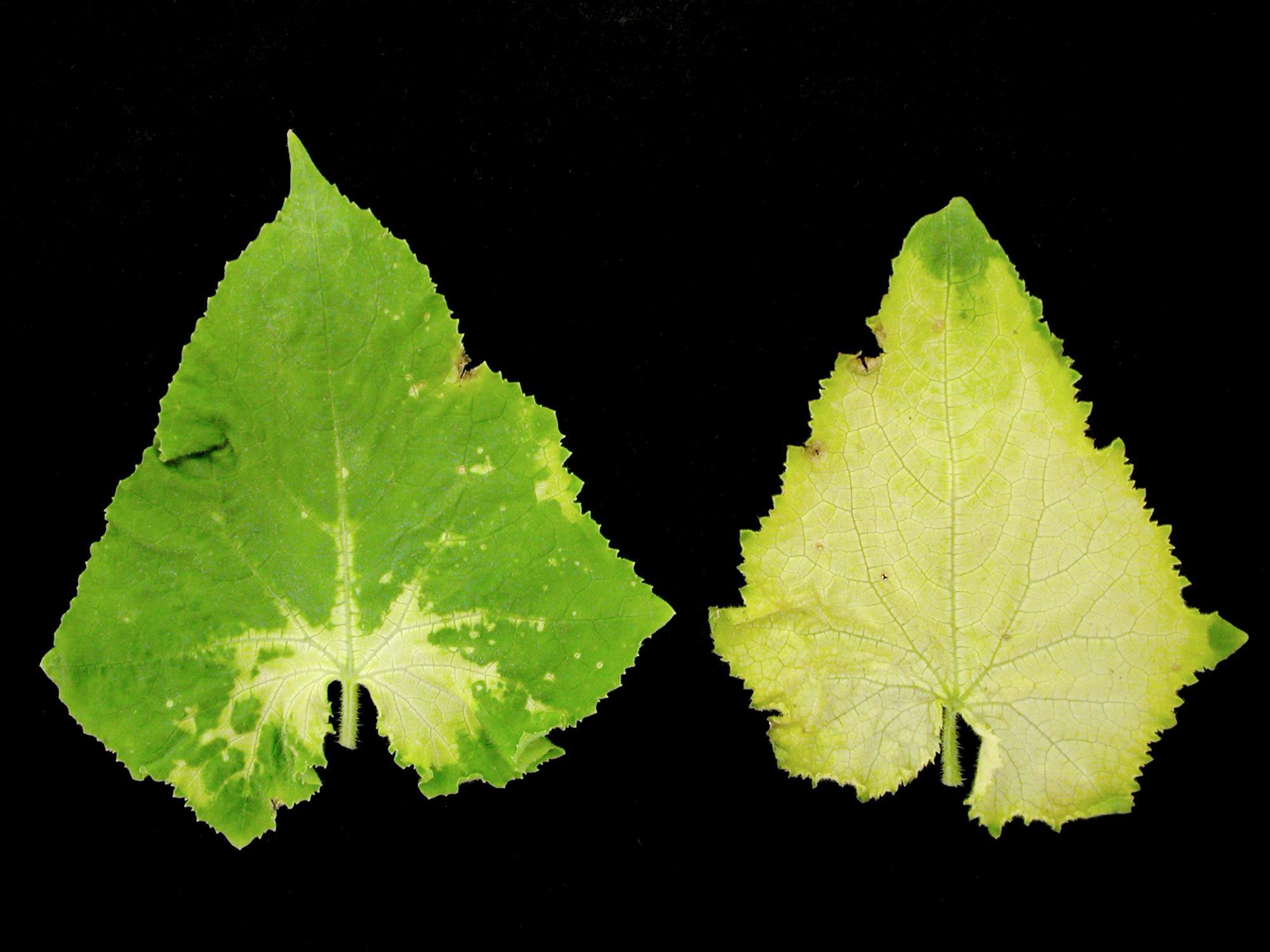 Description: Les feuilles de concombres libanais cultivés en serre présentent un jaunissement varié apparaissant à divers endroits. De gauche à droite, nous observons : 1) un jaunissement du limbe et des nervures principales, à la base de la feuille et 2) une marge verte sur le limbe jaune.