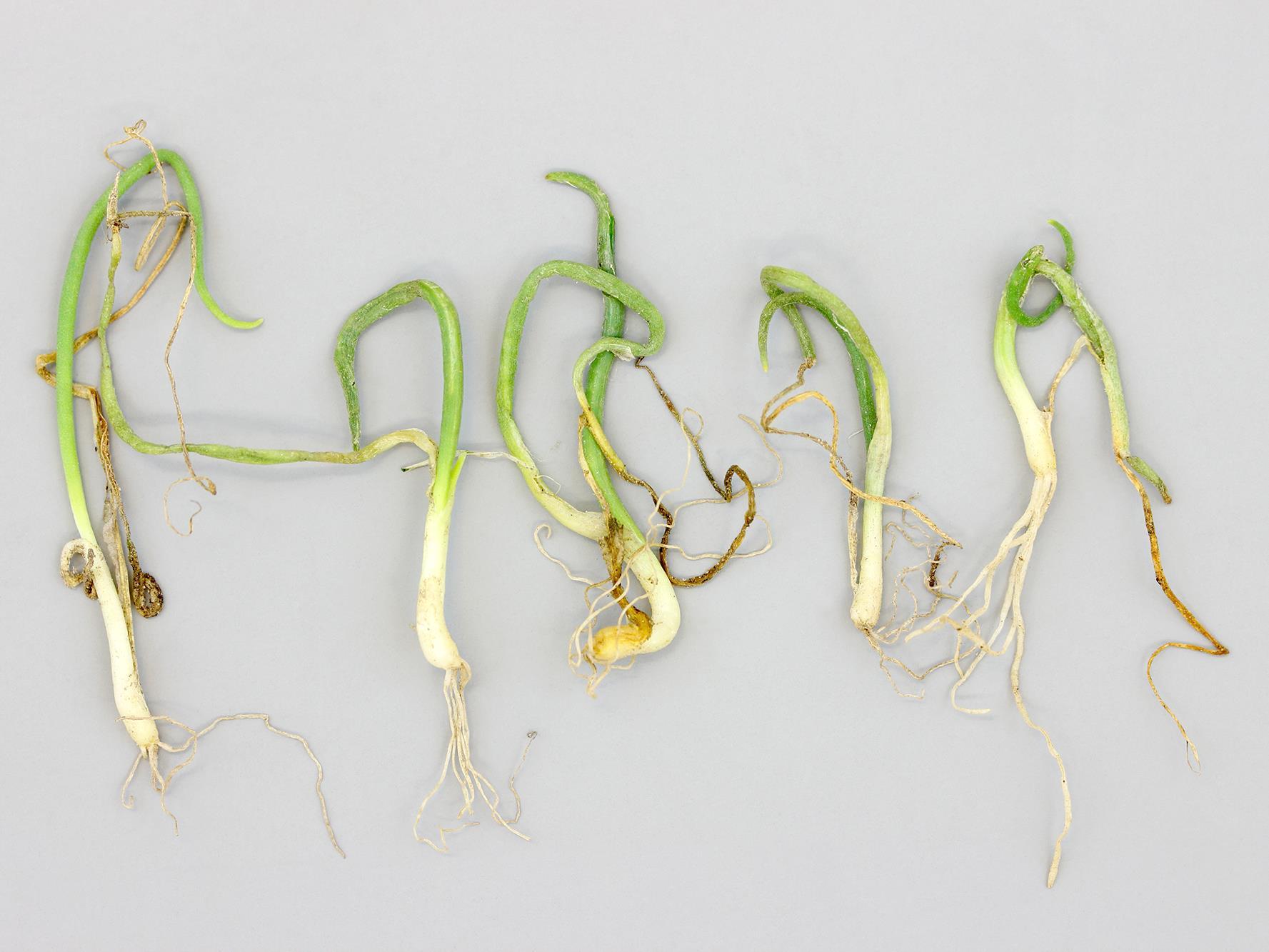 Description: Les plantules d'oignon sec provenant d’un champ présentent de sévères malformations au niveau des feuilles et du collet. Les feuilles sont enroulées en spirale ou en forme de crochet. Quant à lui, le collet est soit gonflé ou recourbé. La taille des plants est également réduite. Les dommages observés sont attribuables à une phytotoxicité par l’herbicide FRONTIER MAX (diméthénamide-P) appliqué trop tôt en saison (en préémergence). Au champ, plus de 75 % des plants sont affectés.