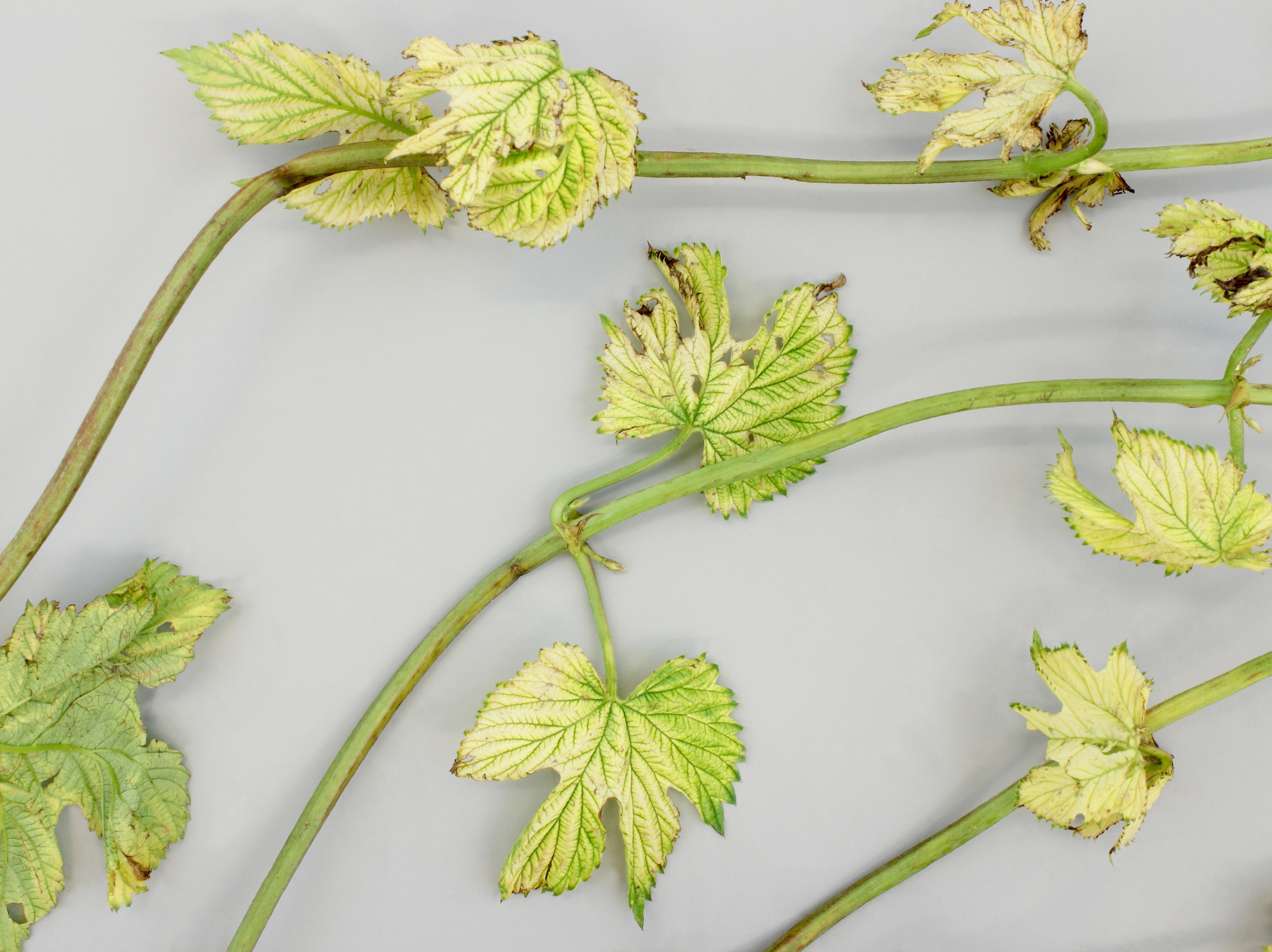 Description: Une vue rapprochée des tiges feuillées de houblon montre un blanchiment à jaunissement du limbe entre les nervures qui demeurent vertes. Quelques brûlures foliaires sont observées. Les feuilles terminales sont les plus affectées. L’analyse chimique effectuée par le Laboratoire d'expertises et d'analyses alimentaires (LEAA) du MAPAQ a révélé la présence de l’herbicide glyphosate dans les tissus endommagés. Les symptômes observés sur le houblon sont très caractéristiques d'une phytotoxicité par le glyphosate.