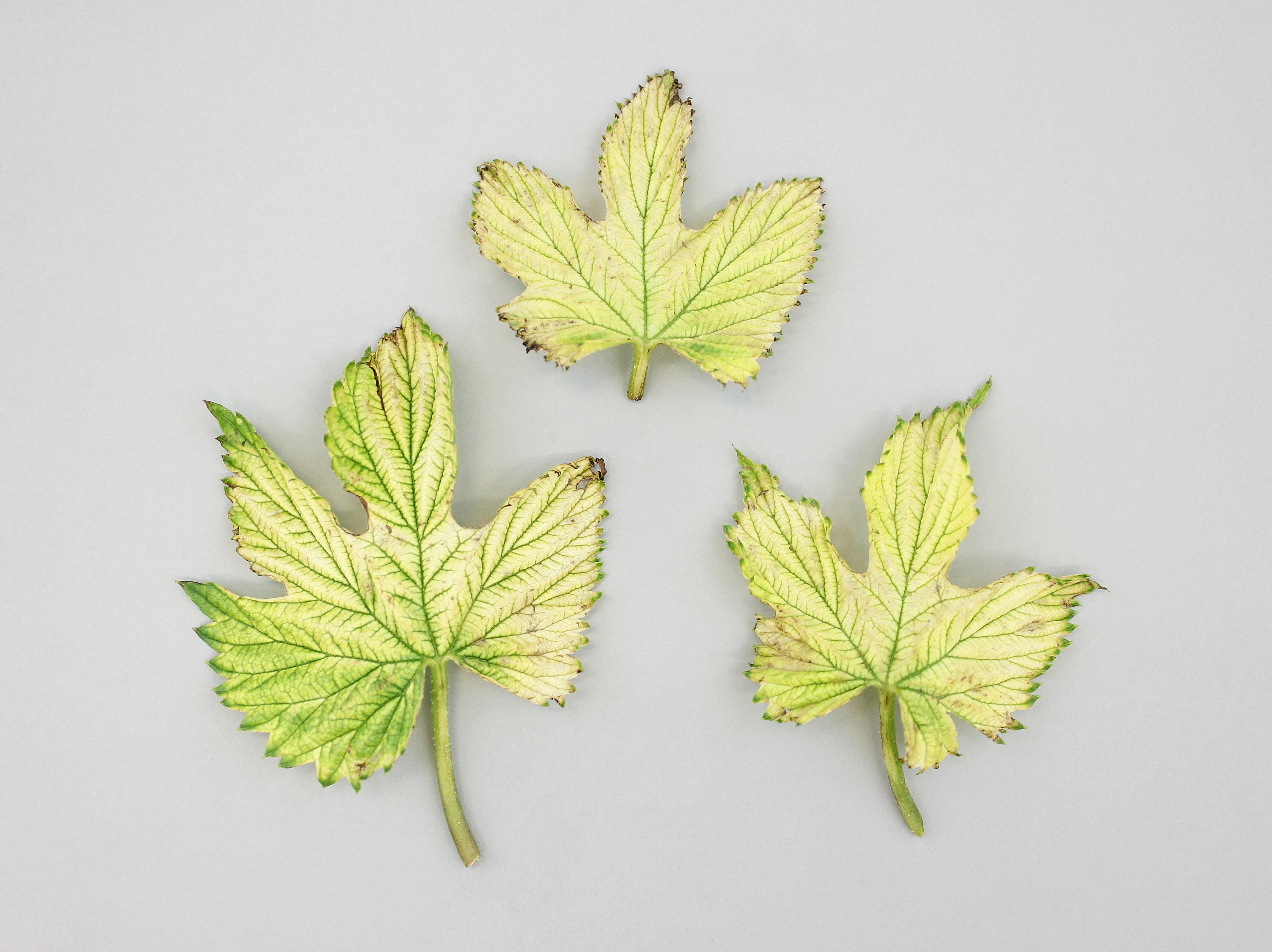 Description: Des feuilles de houblon montrent un blanchiment à jaunissement du limbe entre les nervures qui demeurent vertes. Quelques brûlures foliaires sont observées. Les feuilles terminales sont les plus affectées. L’analyse chimique effectuée par le Laboratoire d'expertises et d'analyses alimentaires (LEAA) du MAPAQ a révélé la présence de l’herbicide glyphosate dans les tissus endommagés. Les symptômes observés sur le houblon sont très caractéristiques d'une phytotoxicité par le glyphosate.