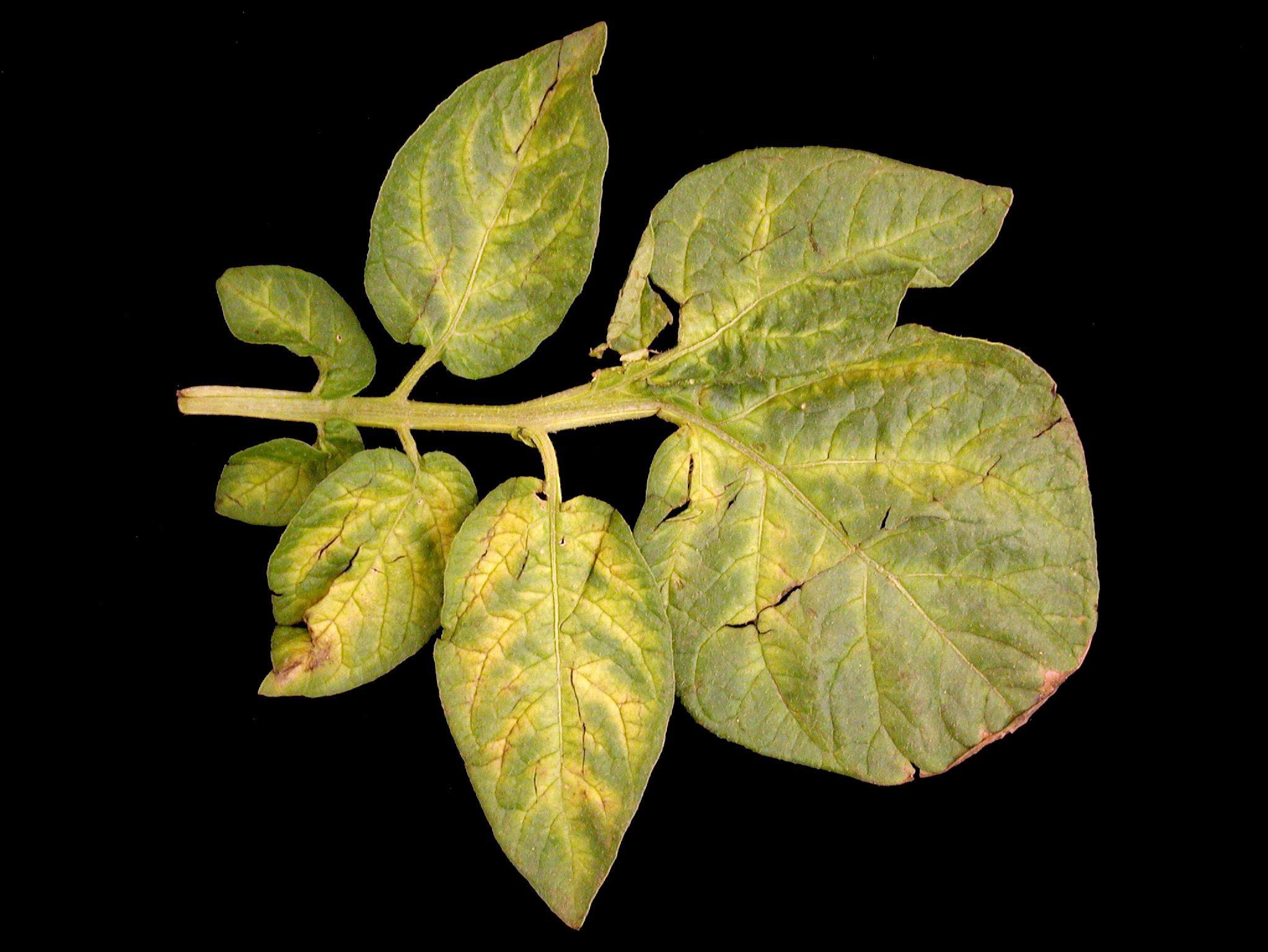 Description: Une feuille basale de pomme de terre (cv 'Envol') montre des folioles avec des nervures jaunes. Les feuilles les plus affectées étaient complètement jaunes avec une brûlure de la marge qui débutait par l’apex. Les jeunes feuilles étaient saines. Les dommages sont caractéristiques d’une phytotoxicité à la métribuzine (SENCOR) et le cultivar 'Envol' serait particulièrement sensible.