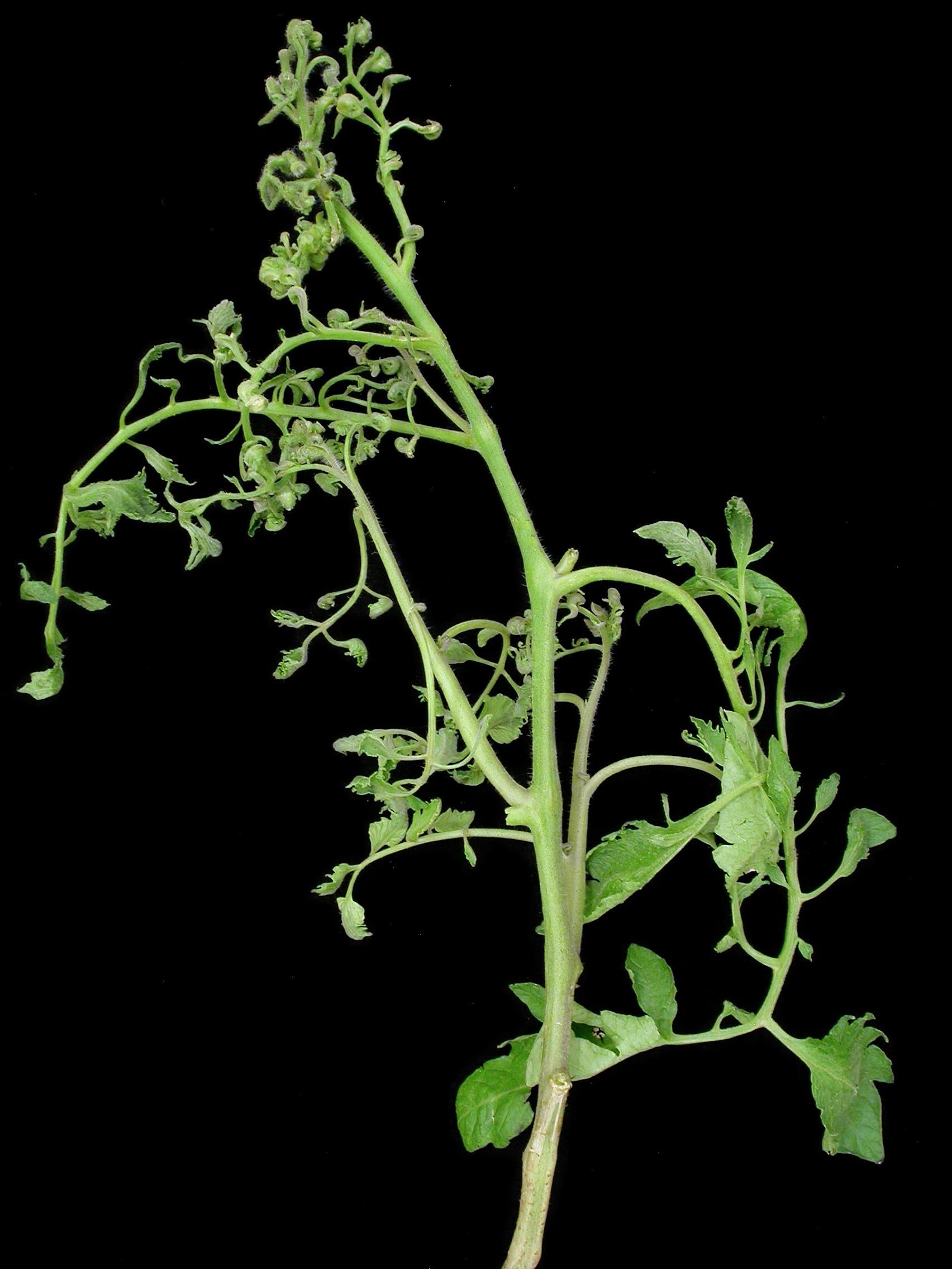 Description: L’extrémité d’un jeune plant de tomate de serre (cv 'Trust') montre une malformation des feuilles médianes et terminales et de la tige. Sur les feuilles, les malformations se manifestent par des feuilles en forme de cuillère, des nervures parallèles et une marge frisée. Les feuilles terminales les plus affectées sont enroulées et très peu développées. La tige est sinueuse dans la partie terminale. Le résultat des analyses effectuées par le Laboratoire d'expertises et d'analyses alimentaires (LEAA) du MAPAQ a permis de détecter les herbicides suivants du sol et des tissus végétaux : le clopyralide (sol et tissus végétaux), le 2, 4-DB (sol et tissus) et le MCPB (sol et tissus). Tous ces produits peuvent provoquer des malformations et nuire à la croissance des plantes. La tolérance zéro s’applique à ces produits dans le sol et les tissus végétaux. Tous les plants de la serre étaient affectés et cultivés dans un mélange organique composé de tourbe et de compost provenant d’une champignonnière. Le compost utilisé contenait probablement des résidus d’herbicide.