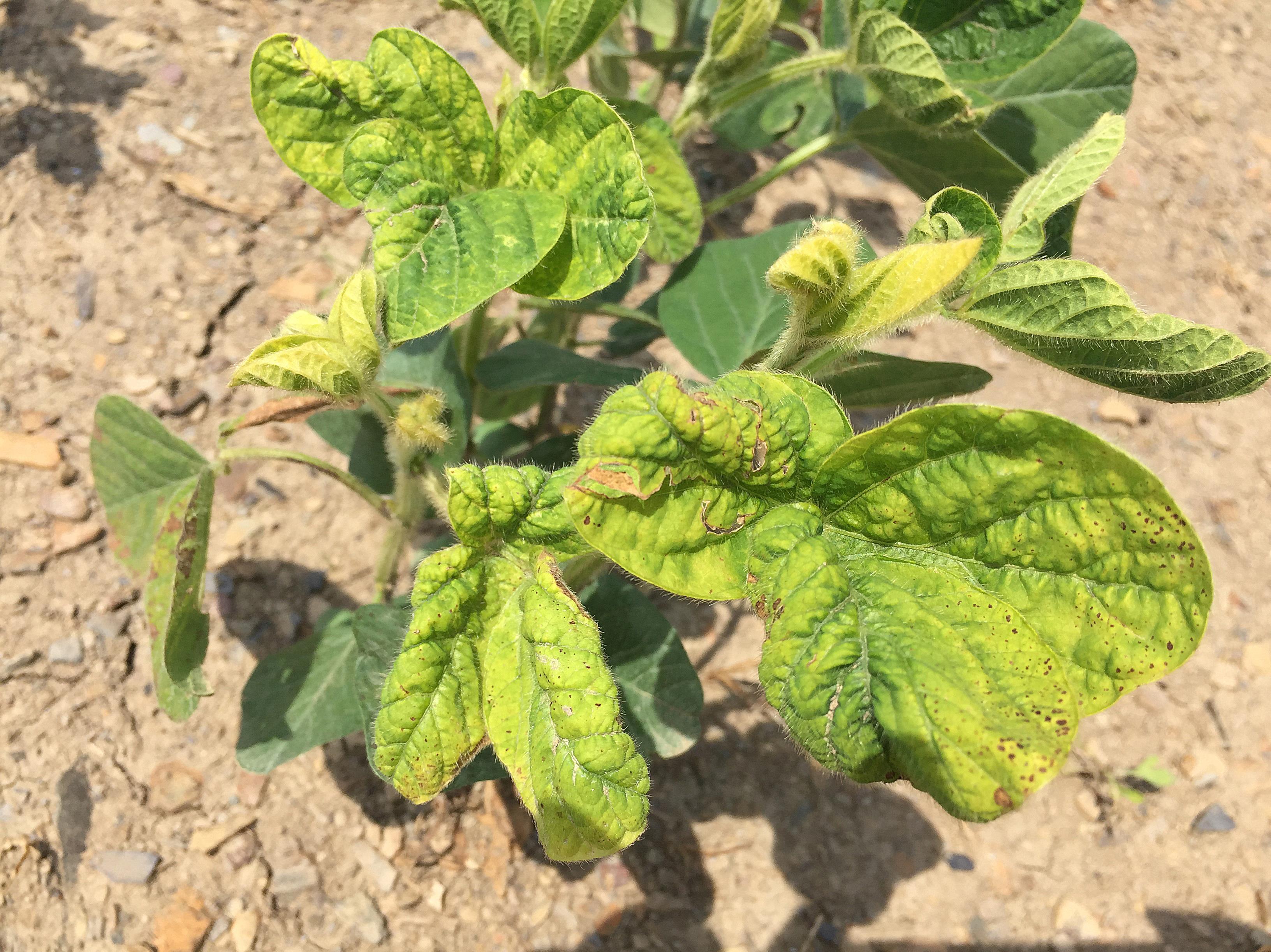 Description: Jaunissement à blanchiment internervaire, accompagné d’une brûlure des tissus, sur des feuilles de plants de soya. Ces symptômes sont attribuables à l’application d’herbicides contenant des résidus de mésotrione (et d’atrazine). L’application de mésotrione dans une culture de soya peut occasionner d’importants dommages, des pertes de rendement voire la mort de la culture.