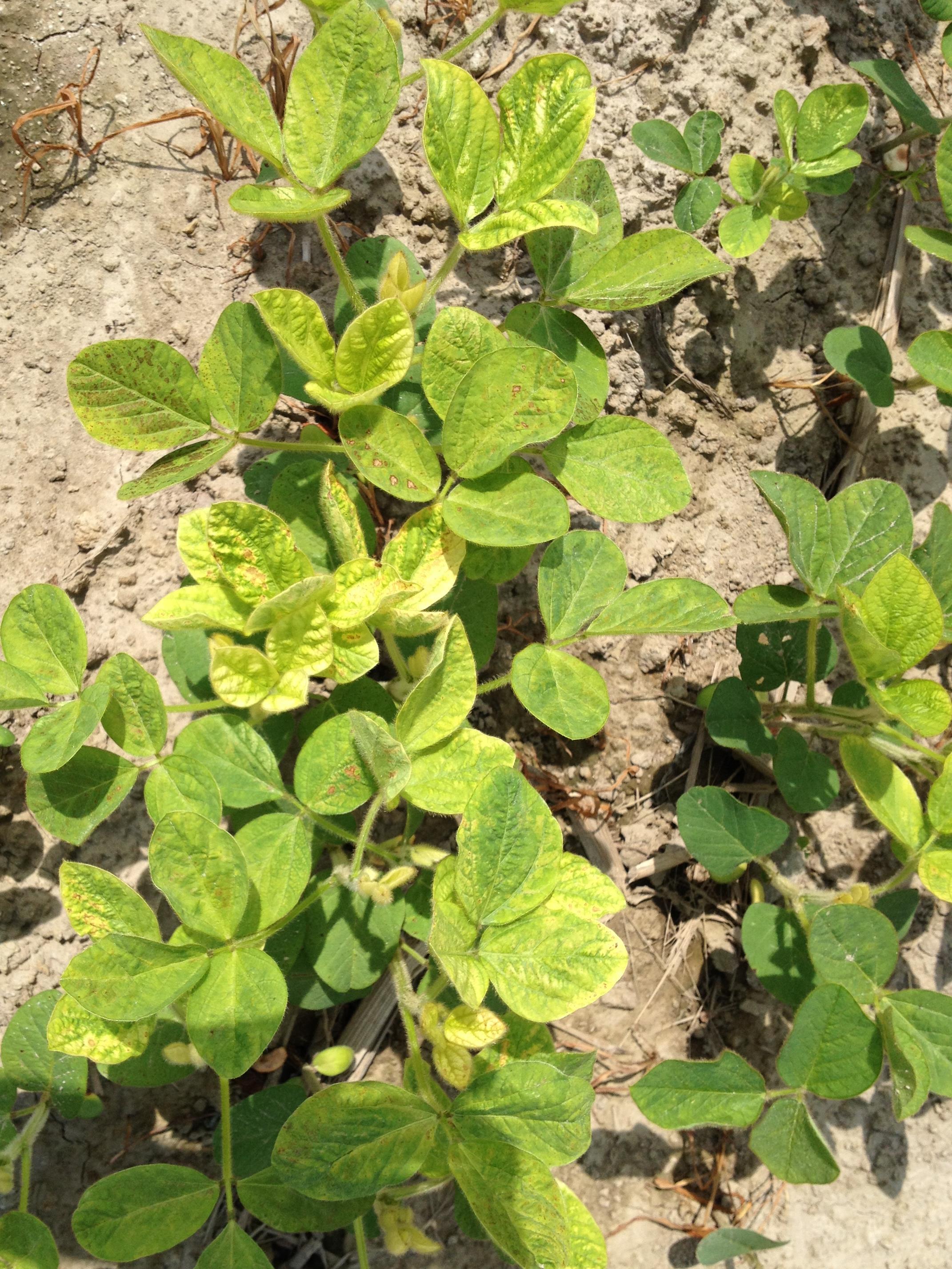 Description: Sur un rang de soya, les feuilles montrent un jaunissement à blanchiment internervaire des tissus. Ce symptôme est attribuable aux résidus de mésotrione dans le réservoir du pulvérisateur, suivant une application de l’herbicide HALEX (glyphosate; S-métolachlore; mésotrione) et d’atrazine, dans un champ de maïs. Typiquement, les plantes sensibles à la mésotrione présentent un blanchiment (ou un jaunissement) internervaire, suivi d’une nécrose des tissus. L’application de mésotrione dans une culture de soya peut occasionner d’importants dommages, des pertes de rendement voire la mort de la culture. Les résidus d’atrazine pourraient aussi avoir provoqué les symptômes de brûlure, présents sur les feuilles de soya.