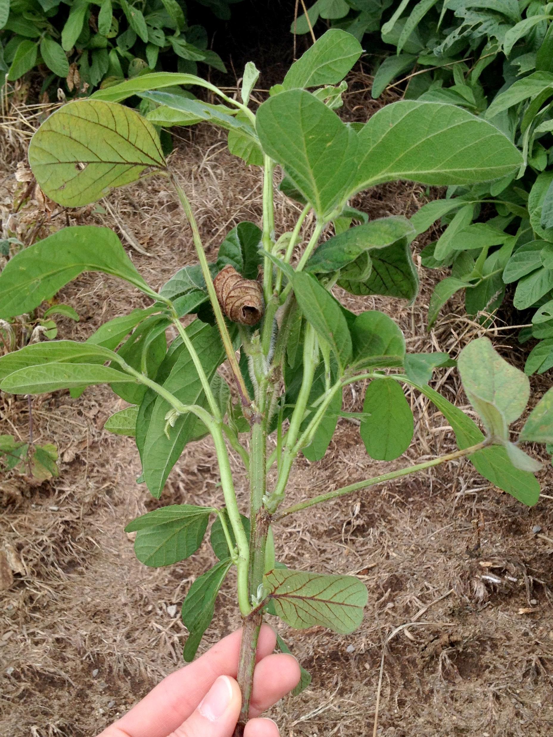 Description: Plant de soya montrant une nervation pourpre à la face inférieure des feuilles. Ces symptômes sont attribuables à un résidu de l’herbicide PERMIT® WG (halosulfuron) dans le réservoir du pulvérisateur. Ce dernier n’aurait pas été nettoyé adéquatement, suite à sa pulvérisation, dans un champ voisin.