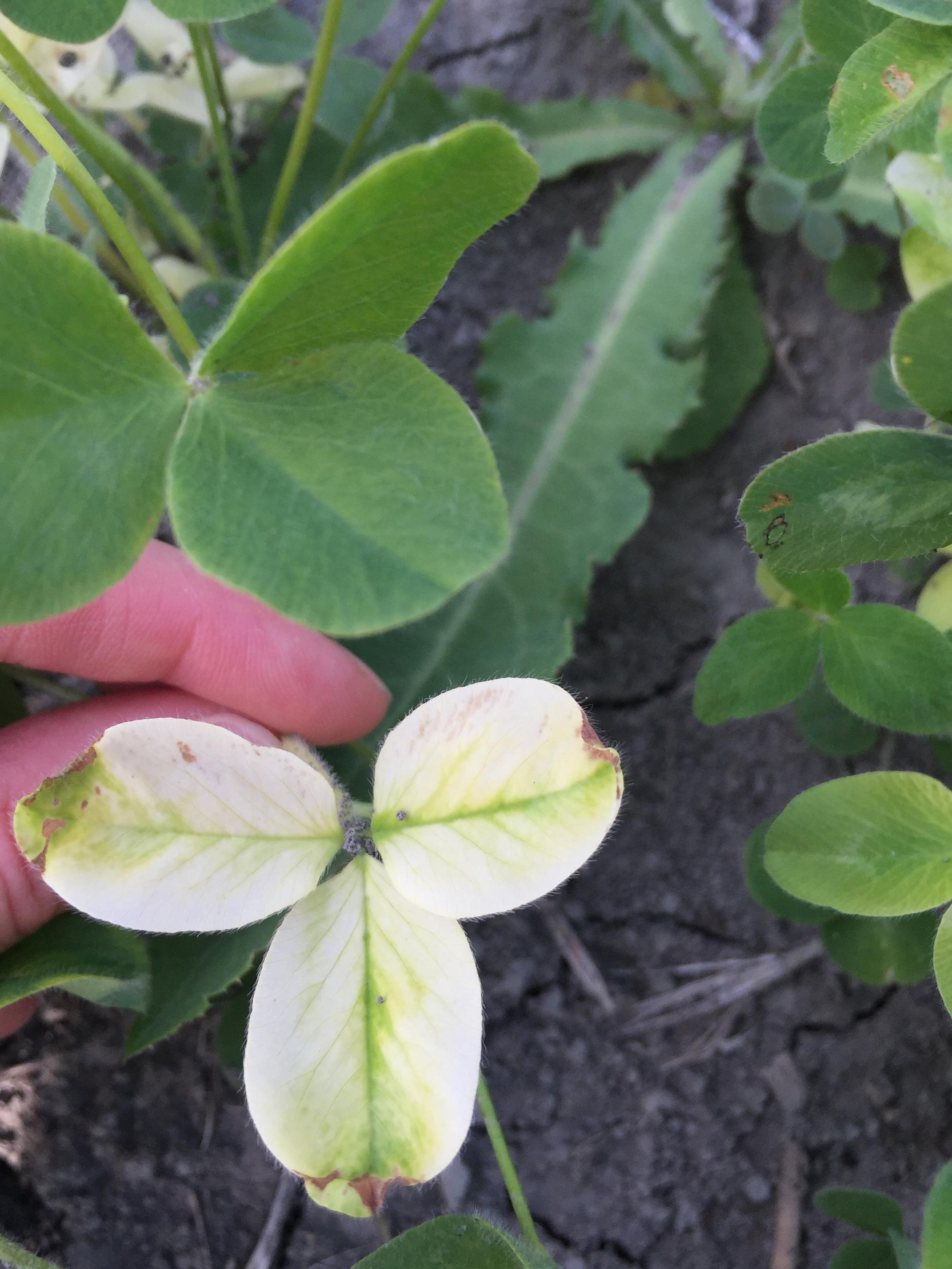 Description: Jaunissement à blanchiment internervaire d'une feuille de trèfle, attribuable aux résidus de CALLISTO® 480 SG (mésotrione), appliqué dans la parcelle, entre 15 à 30% de la dose recommandée. Typiquement, les plantes sensibles à la mésotrione présentent un blanchiment (ou un jaunissement) internervaire, suivi d’une nécrose des tissus. La mésotrione n'est pas homologuée dans le trèfle et peut occasionner d’importants dommages à la culture, des pertes de rendement voire la mort de la culture.
