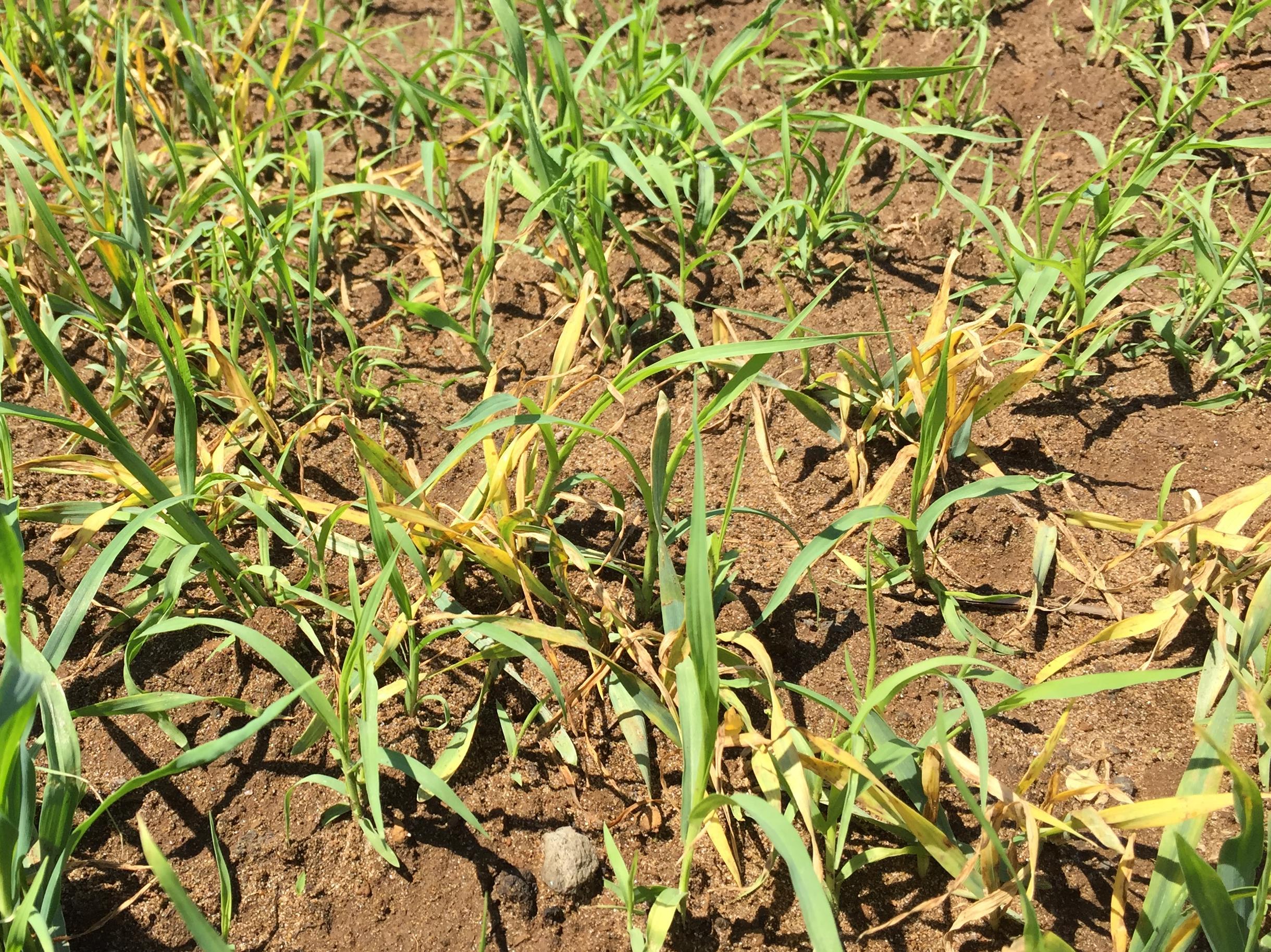 Légende: Jaunissement et brûlure sur plants d’orge