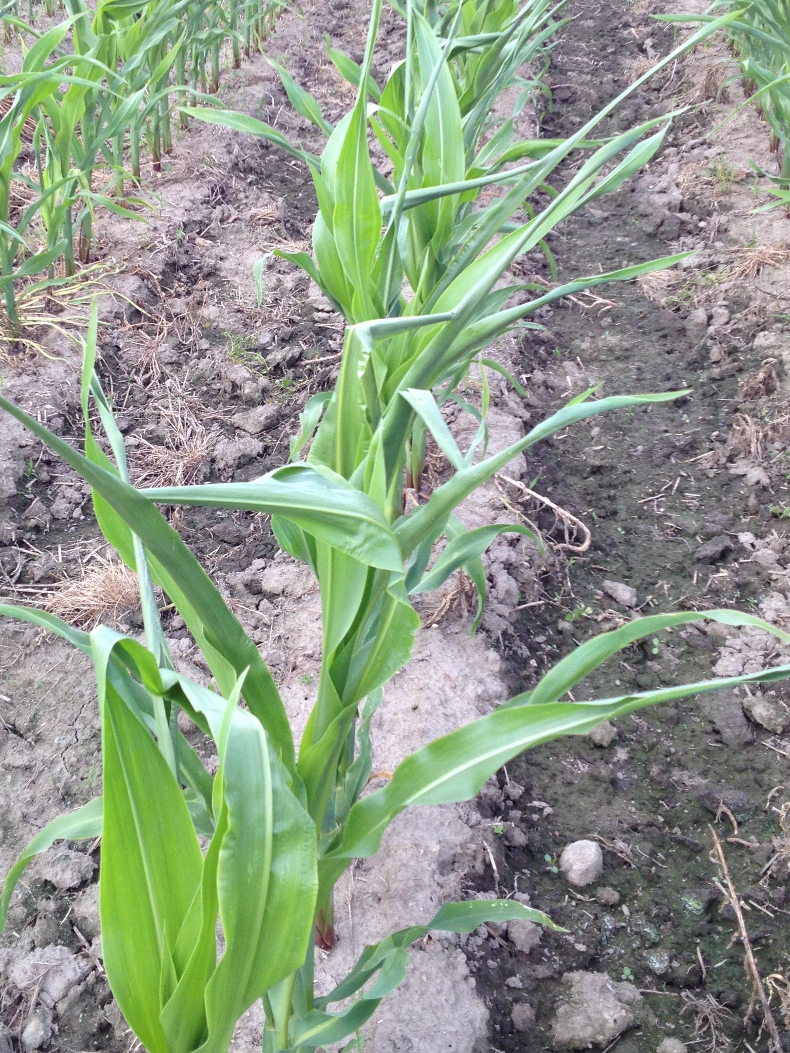 Description: Les feuilles de plants de maïs ne se déploient pas normalement, elles sont enroulées en « queue d’oignon » (« onion leafing »). Ces malformations sont le résultat d’une phytotoxicité par le MCPA, appliqué trop tardivement sur la culture. Les symptômes sont apparus environ deux semaines suite à l’application de l’herbicide. Suite à une pluie, le produit a été lessivé et serait entré en contact avec les racines, ce qui a probablement aussi affecté les plantules.