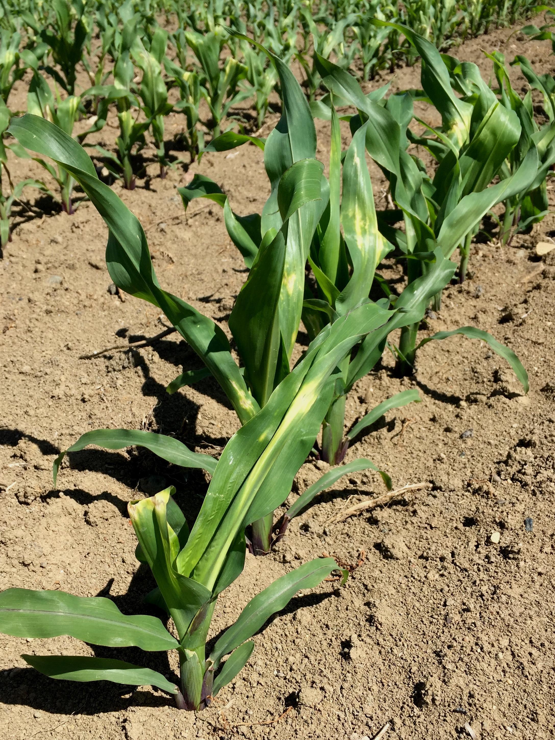 Légende: Plants de maïs avec jaunissement et coloration pourpre des feuilles