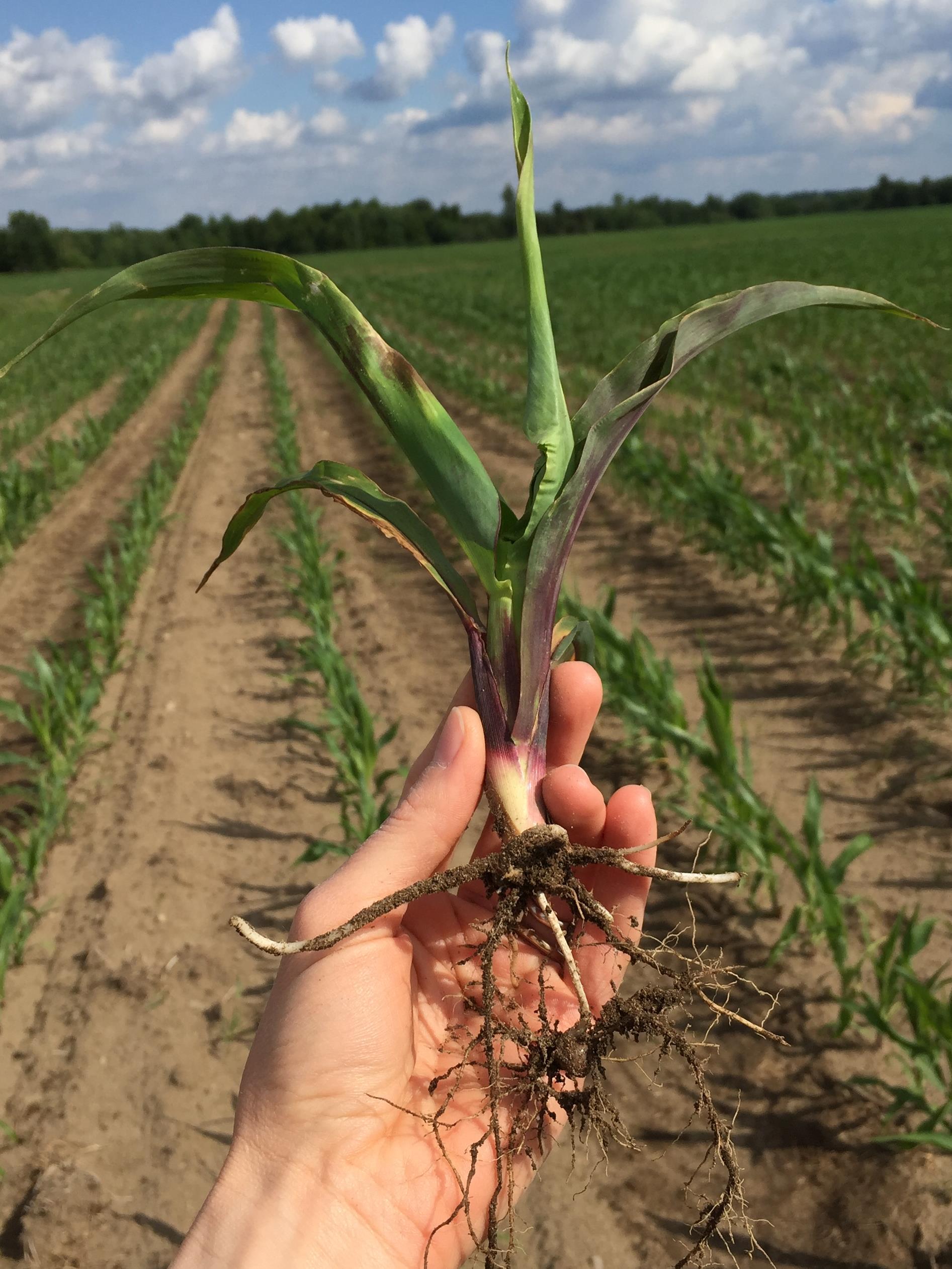 Description: Les feuilles d’un plant de maïs sont enroulées sur elles-mêmes, montrent un jaunissement à l'apex ainsi qu’une coloration pourpre ou des brûlures à la marge du limbe. De plus, le système racinaire est atrophié et des racines poussent à l’horizontal. Ces symptômes sont le résultat d’une application par erreur de FREESTYLE, un mélange commercial contenant deux herbicides du groupe 2 : le chlorimuron-éthyle et l’imazéthapyr. Ce mélange d'herbicides est homologué dans la culture du soya et des légumineuses mais pas dans celle du maïs. L'application aurait été réalisée environ 2 semaines auparavant. Les symptômes typiques de phytotoxicité (coloration pourpre à violet, blanchiment à jaunissement, atrophie du système racinaire, enroulement des feuilles du cornet, etc.) peuvent n’apparaître qu’une à trois semaines suivant l’application, selon les conditions de croissance et la vulnérabilité des espèces présentes. Le maïs est très sensible à la famille des imidazolinones dont l’imazéthapyr fait partie. La dose du mélange appliqué est inconnue.