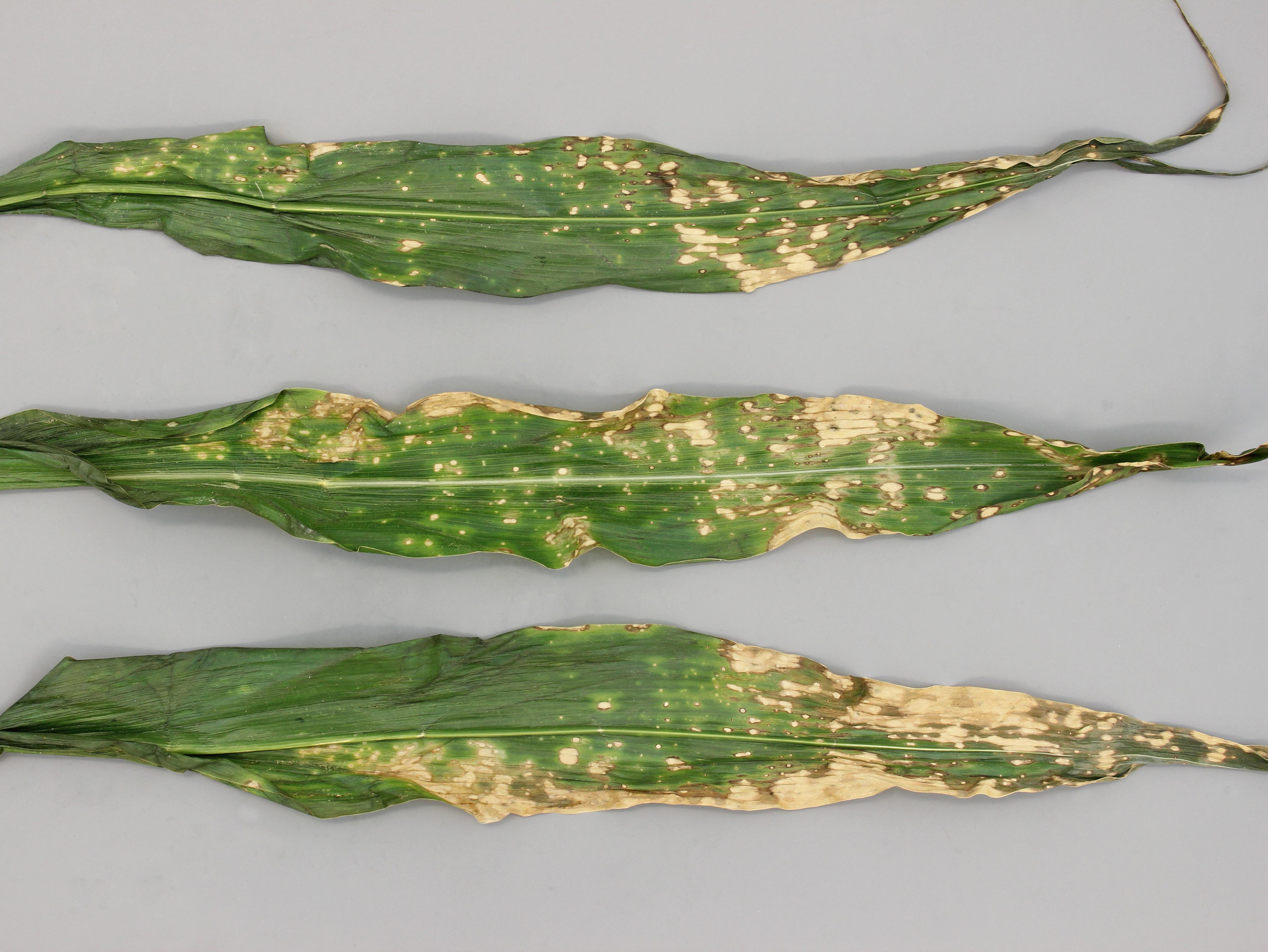 Description: Des feuilles de maïs grain tolérant au glyphosate présentent des brûlures circulaires de couleur beige, confluentes en plusieurs endroits (plages brûlées), et distribuées principalement à l’apex. Elles sont apparues soudainement dans un champ de maïs grain, situé en bordure d’un champ d’asperge, traité avec le paraquat (GRAMOXONE®), une semaine auparavant. Les symptômes observés sur le maïs sont typiques de ceux causés par le paraquat, un herbicide de contact. La dérive du produit affecte environ 40% du champ. Le paraquat est homologué dans la culture du maïs et doit être appliqué en pré-levée pour éviter tout dommage.