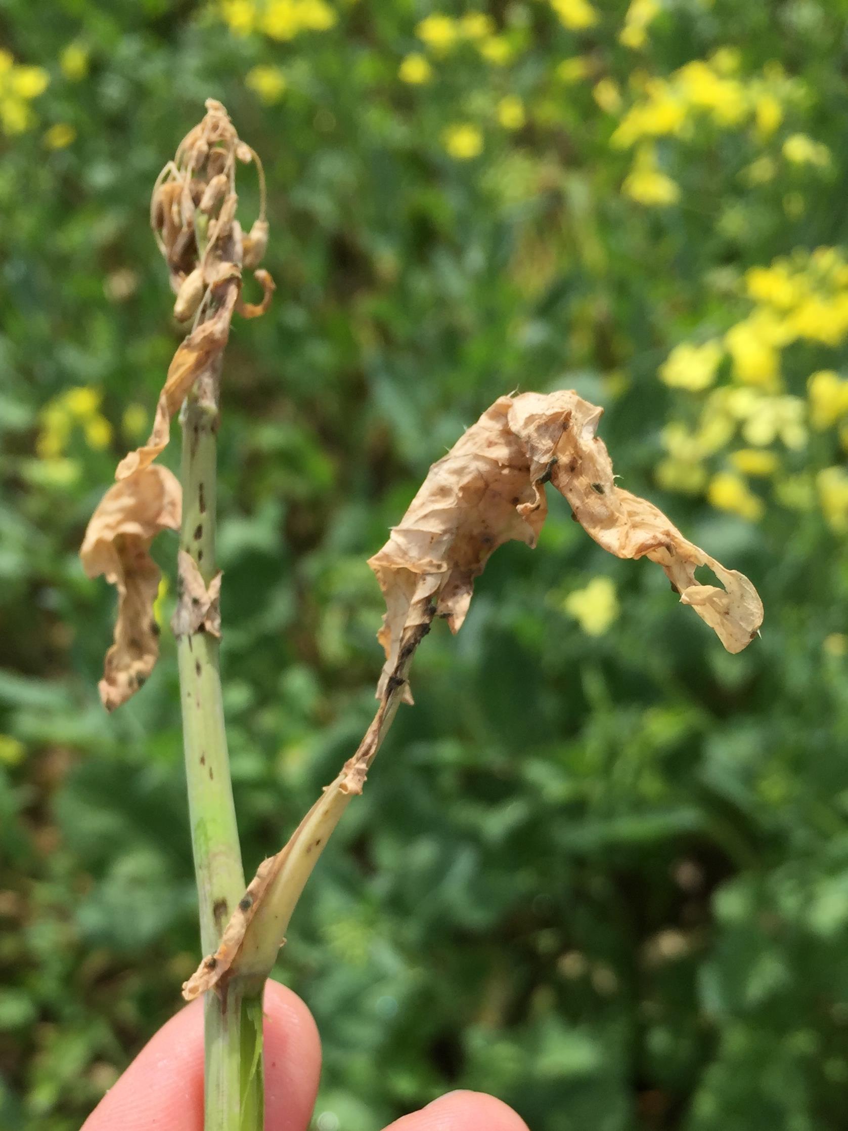 Description: Le bourgeon floral et la feuille terminale d’un plant de canola sont brûlés. Ces symptômes sont observés sur les plants ayant été exposés au recroisemement des pulvérisations faites avec l’herbicide LIBERTY (glufosinate d’ammonium). Tous les tissus des végétaux verts sont sensibles à cet herbicide, sauf les cultures conçues pour le tolérer, à l’exemple du canola. Cependant, la forte dose pulvérisée ici, lors des doubles passages a amené un stress important à la culture.