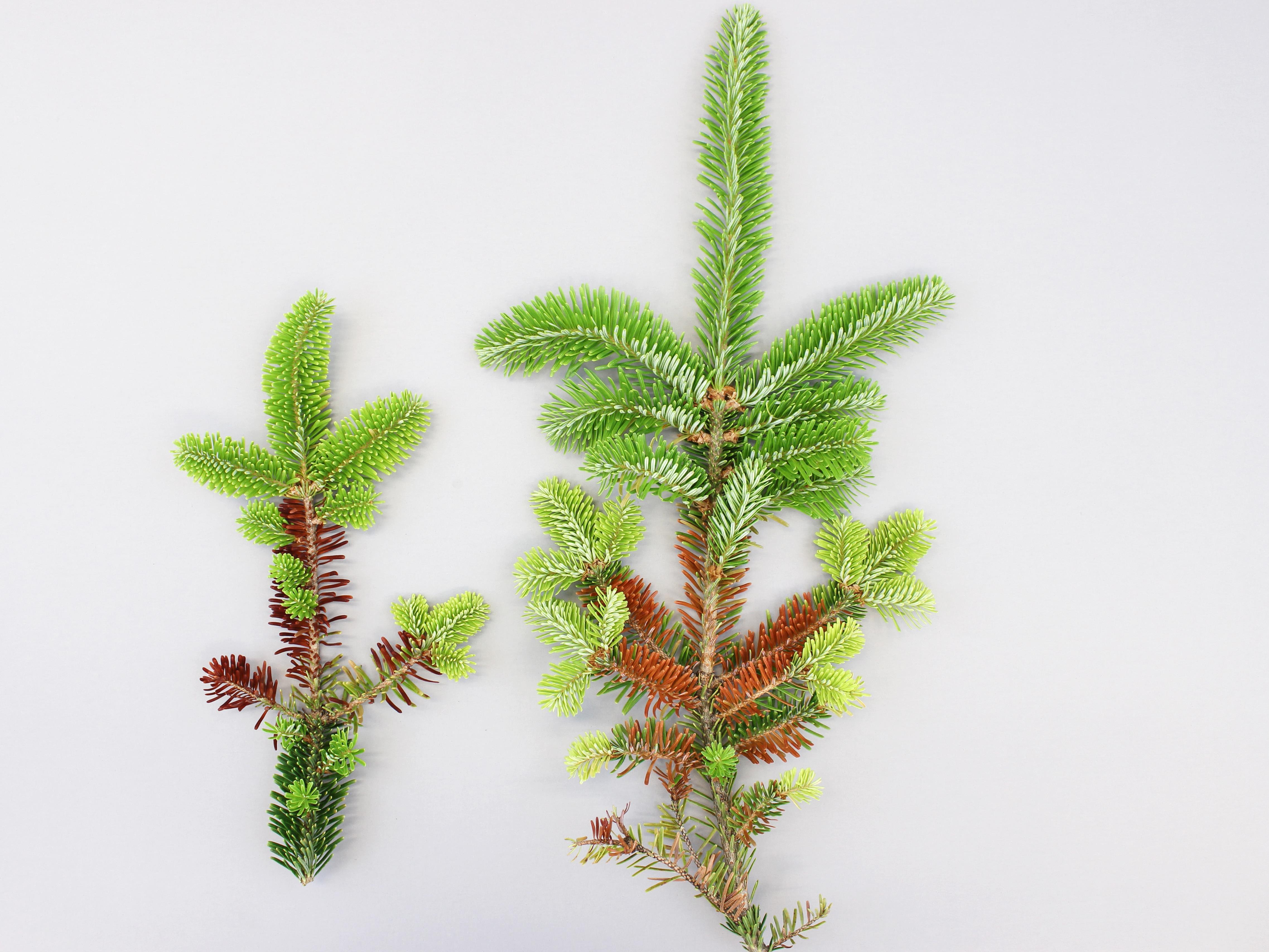 Légende: Pousses de sapin avec jaunissement et brûlures