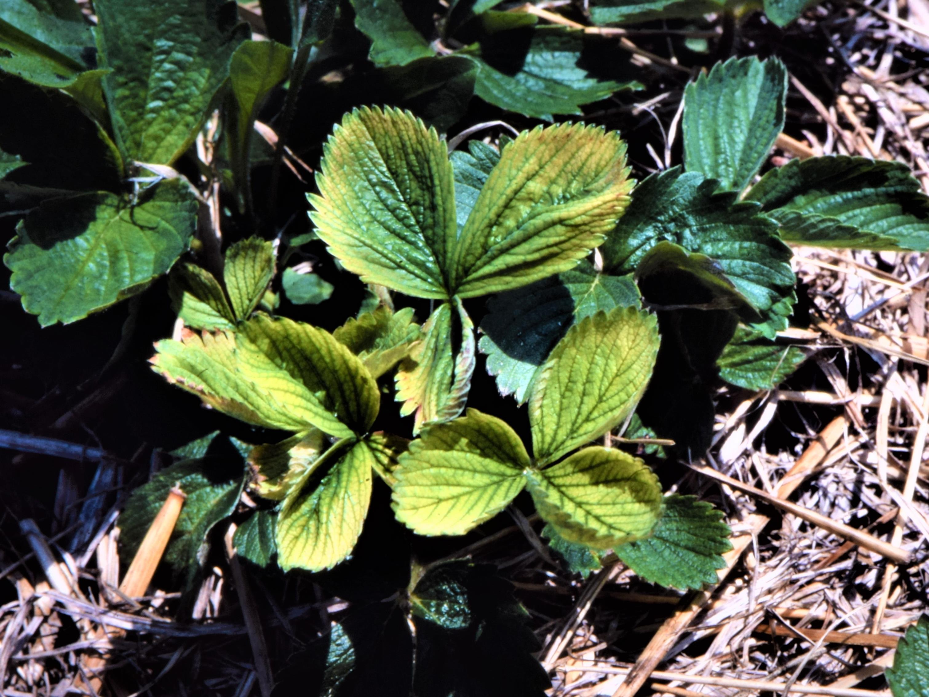 Description: Les feuilles terminales de fraisier montrent un jaunissement internervaire. Ce symptôme est causé par une phytotoxicité occasionnée par l'application de paille de céréales traitée au glyphosate, sur les rangs de la plantation, à l’automne précédent.