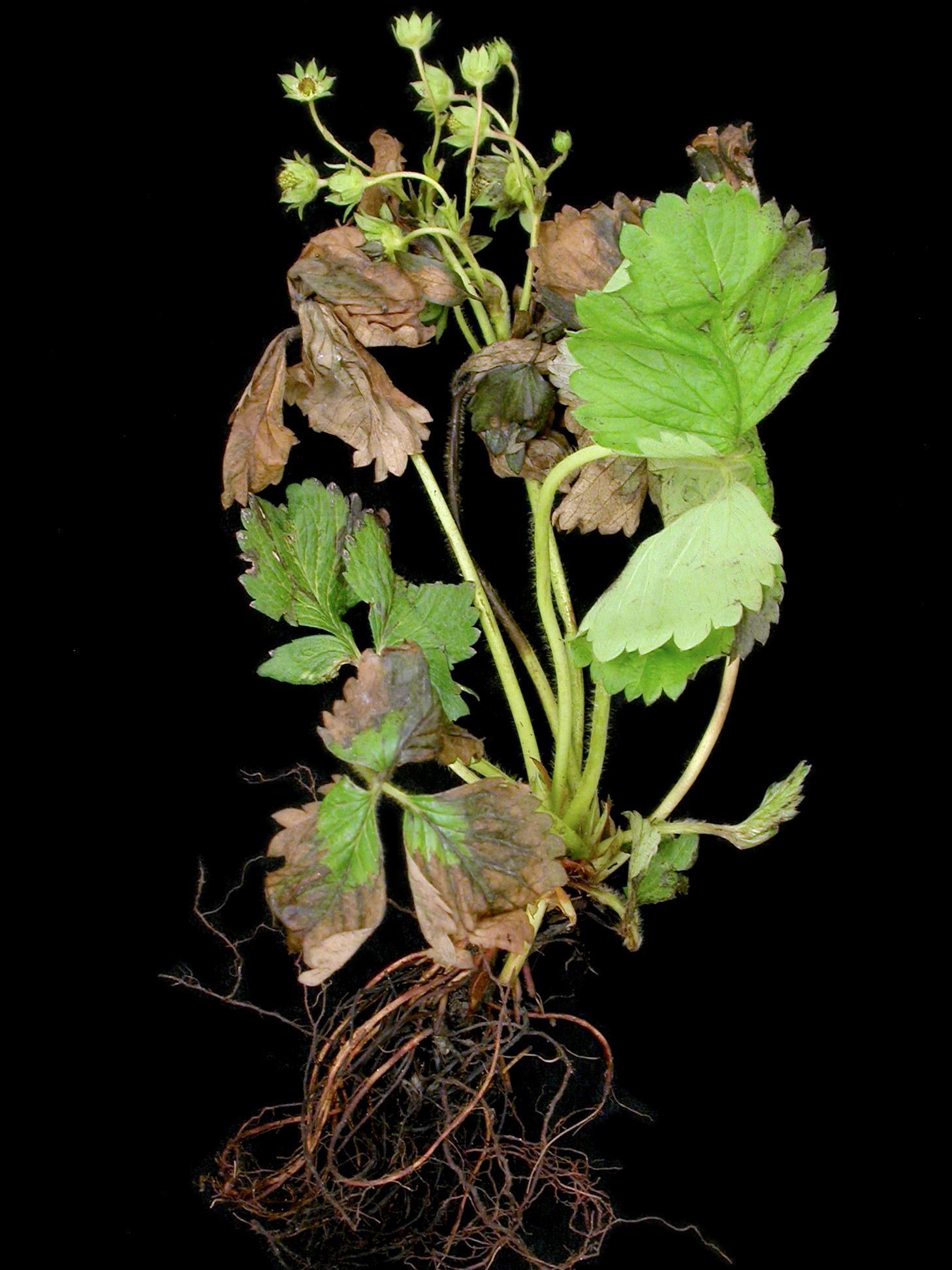 Description: Un plant de fraisier du cv « Jewel » présente un jaunissement des nervures sur quelques feuilles, ainsi que des brûlures importantes, qui débutent à l’apex et à la marge des feuilles puis progressent sur le limbe. Aussi, une partie de la masse racinaire est noirâtre. Ces symptômes sont caractéristiques d’une phytotoxicité causée par le terbacil (SINBAR®), un herbicide ayant été appliqué au printemps dans la plantation. Le terbacil est homologué dans la culture de la fraise. L’étiquette spécifie que « la sensibilité à cet herbicide diffère selon les variétés de fraisiers. Une légère altération du feuillage peut se produire après l’application de l’herbicide ».