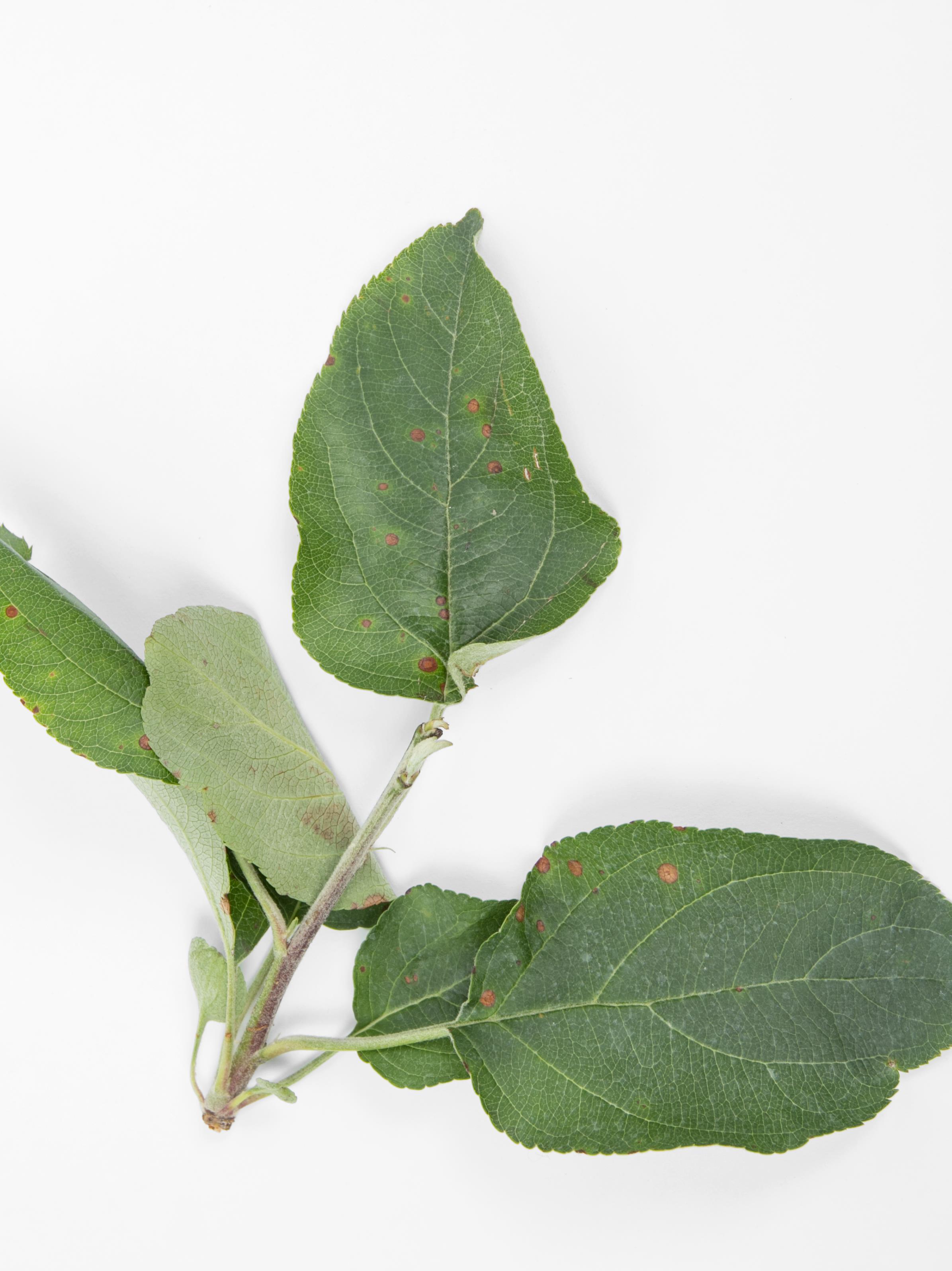 Description: Les feuilles de pommier montrent de petites brûlures circulaires et brunâtres, réparties sur le limbe. Les dommages observés sont le résultat d'une phytotoxicité par la sulfentrazone, appliquée dans un champ de soya voisin. La conseillère mentionne que les pommiers en bordure du champ traité étaient sévèrement affectés et leurs fruits tous atteints. Les symptômes s’estompaient à mesure que l'on s’éloignait du champ traité. Le dosage chimique de l'échantillon a en effet révélé une concentration suffisante en sulfentrazone pour causer les brûlures observées, même si le produit est homologué dans la culture. De l’atrazine et son métabolite, en quantités trop faibles pour nuire à la culture, ainsi que le S-métolachlore, qui ne cause pas ce type de dommage, ont aussi été retrouvés dans l’échantillon.