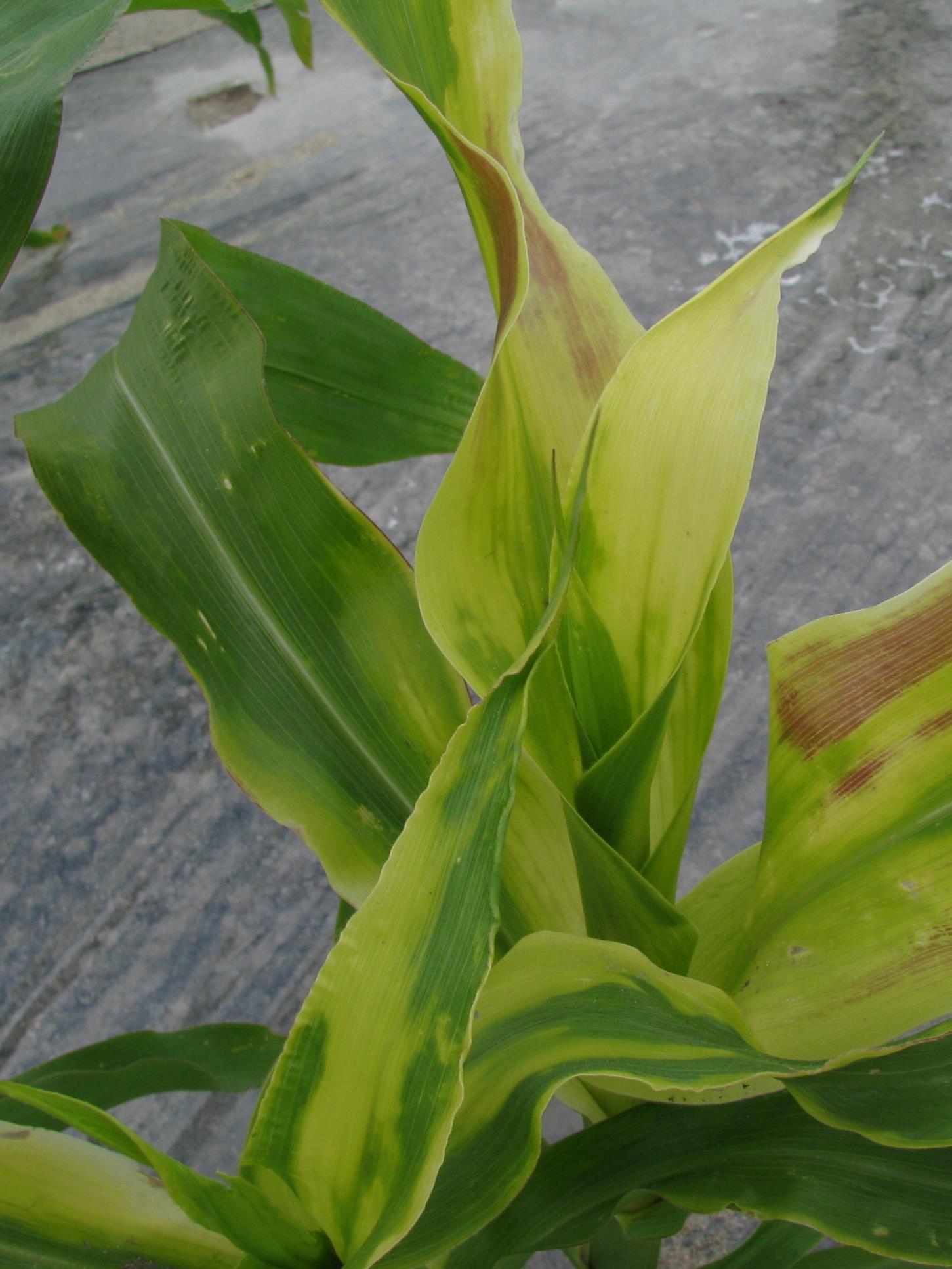 Légende: Décoloration des feuilles d'un plant de maïs sucré