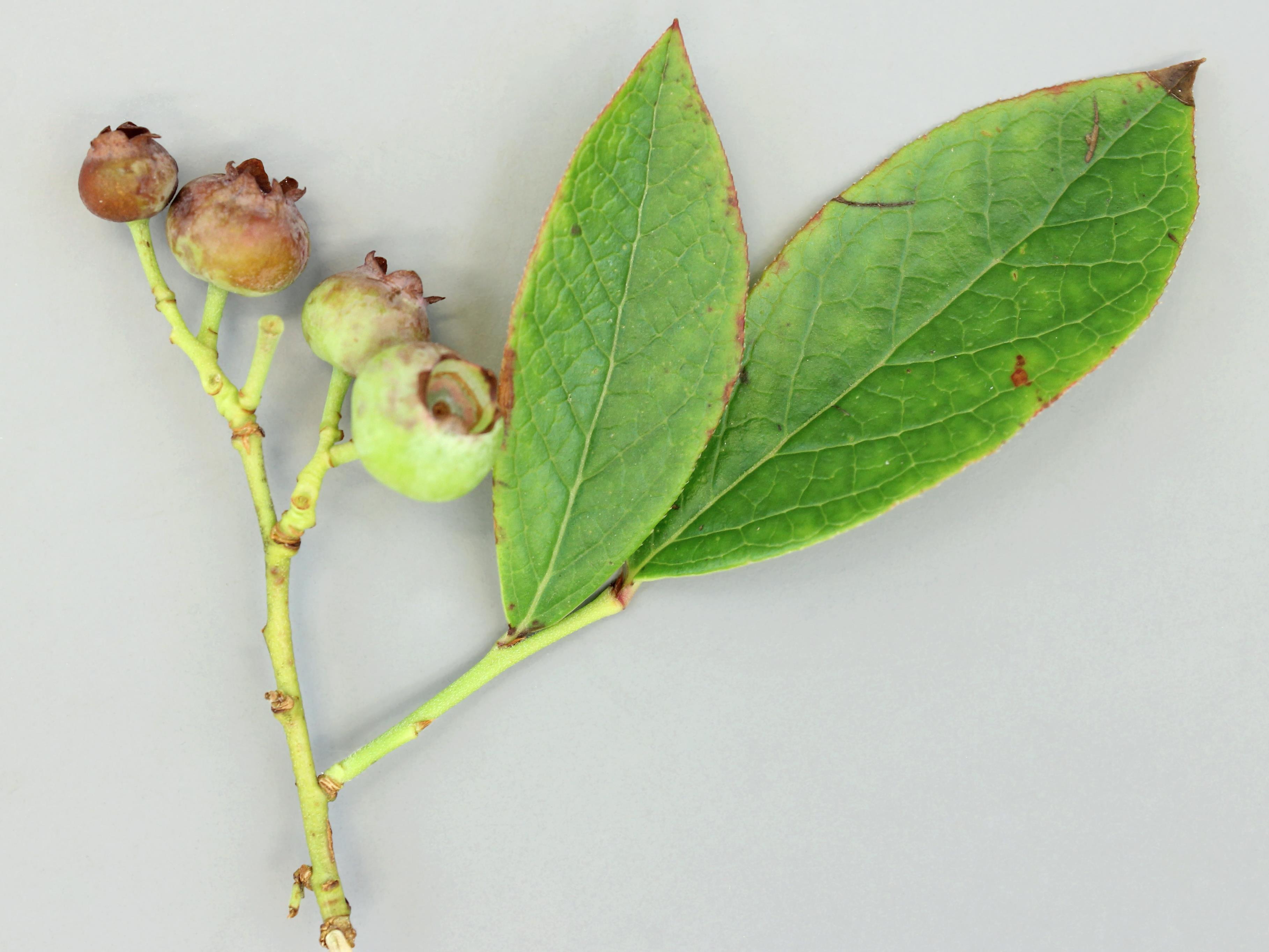 Légende: Brûlures sur fruits et feuilles de bleuet de corymbe