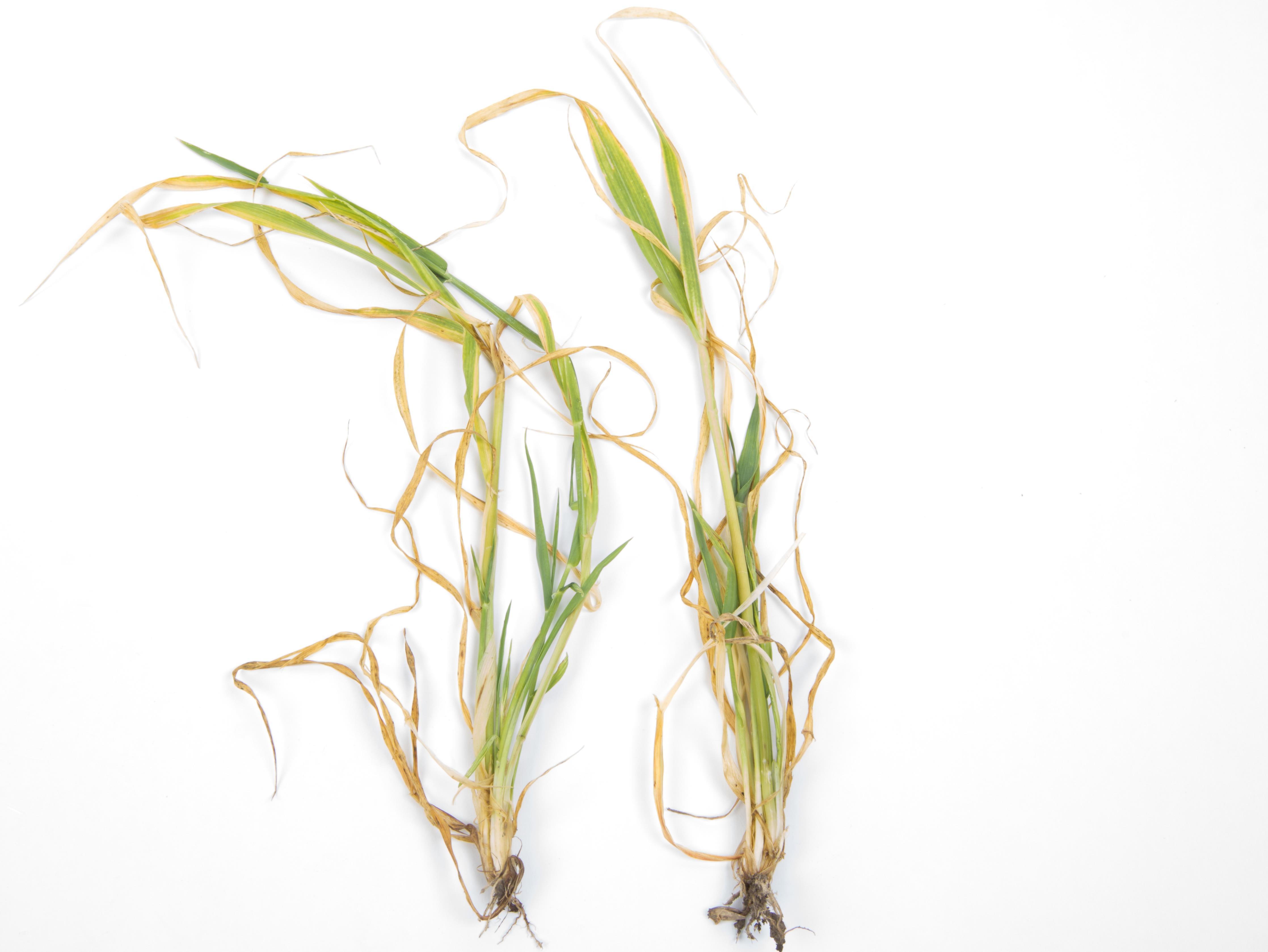Légende: Brûlures et anomalies de coloration sur plants d’orge