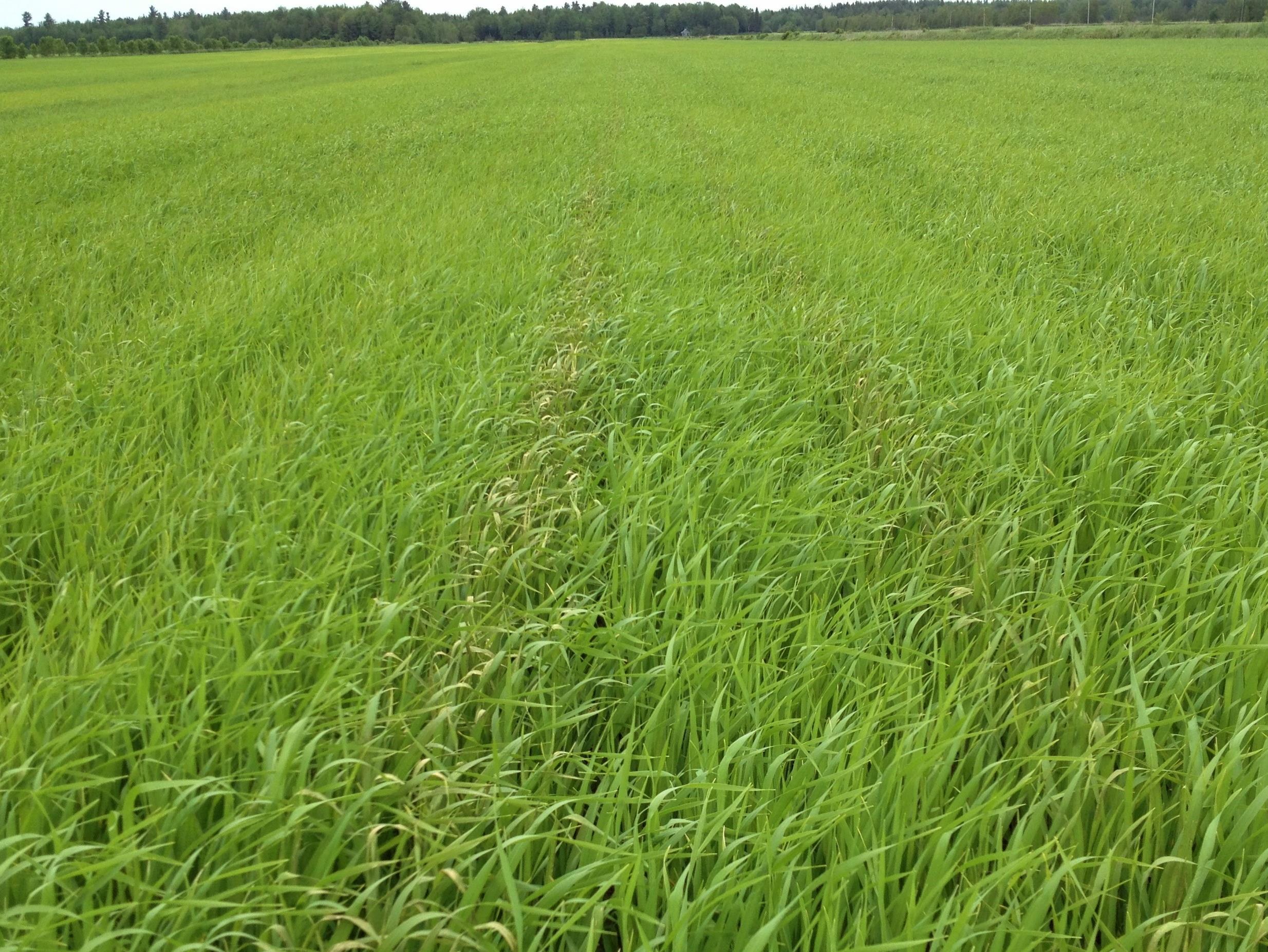 Description: Un champ d’orge présente des rangs dont les plants montrent des brûlures foliaires réparties aléatoirement sur le limbe. Ces symptômes, distribués de façon linéaire dans le champ, sont survenus suite à l’application de l’herbicide REFINE M (emballage commercial - thienfensulfuron-méthyle/tribénuron-méthyle et MCPA (ester)). Une défectuosité dans les buses de pulvérisation entraînant une surdose du produit sur le rang représente l’hypothèse la plus plausible ici pour expliquer les symptômes observés.