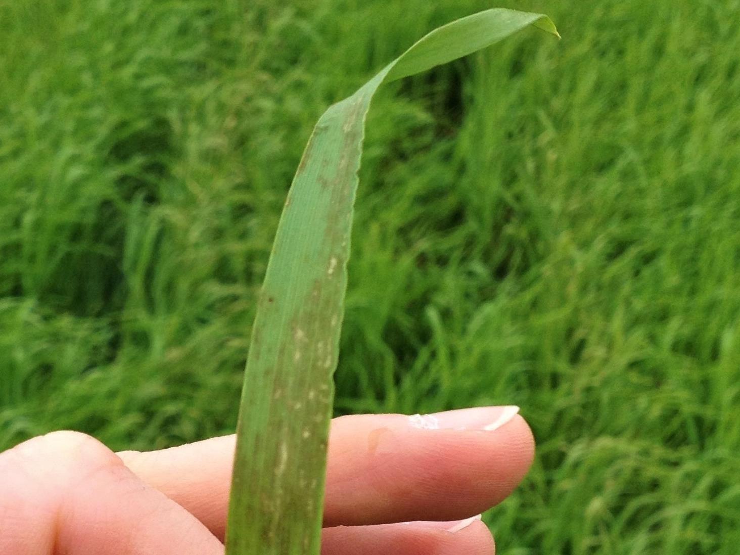 Description: Une feuille d'orge montrent de petites taches foncées (mouchetures) ainsi que des brûlures beiges de forme variable, réparties aléatoirement sur le limbe. Au champ, ces symptômes sont distribués de façon linéaire et sont survenus suite à l’application de l’herbicide REFINE M (emballage commercial - thienfensulfuron-méthyle/tribénuron-méthyle et MCPA (ester)). Une défectuosité dans les buses de pulvérisation entraînant une surdose du produit sur le rang représente l’hypothèse la plus plausible ici pour expliquer les symptômes observés.