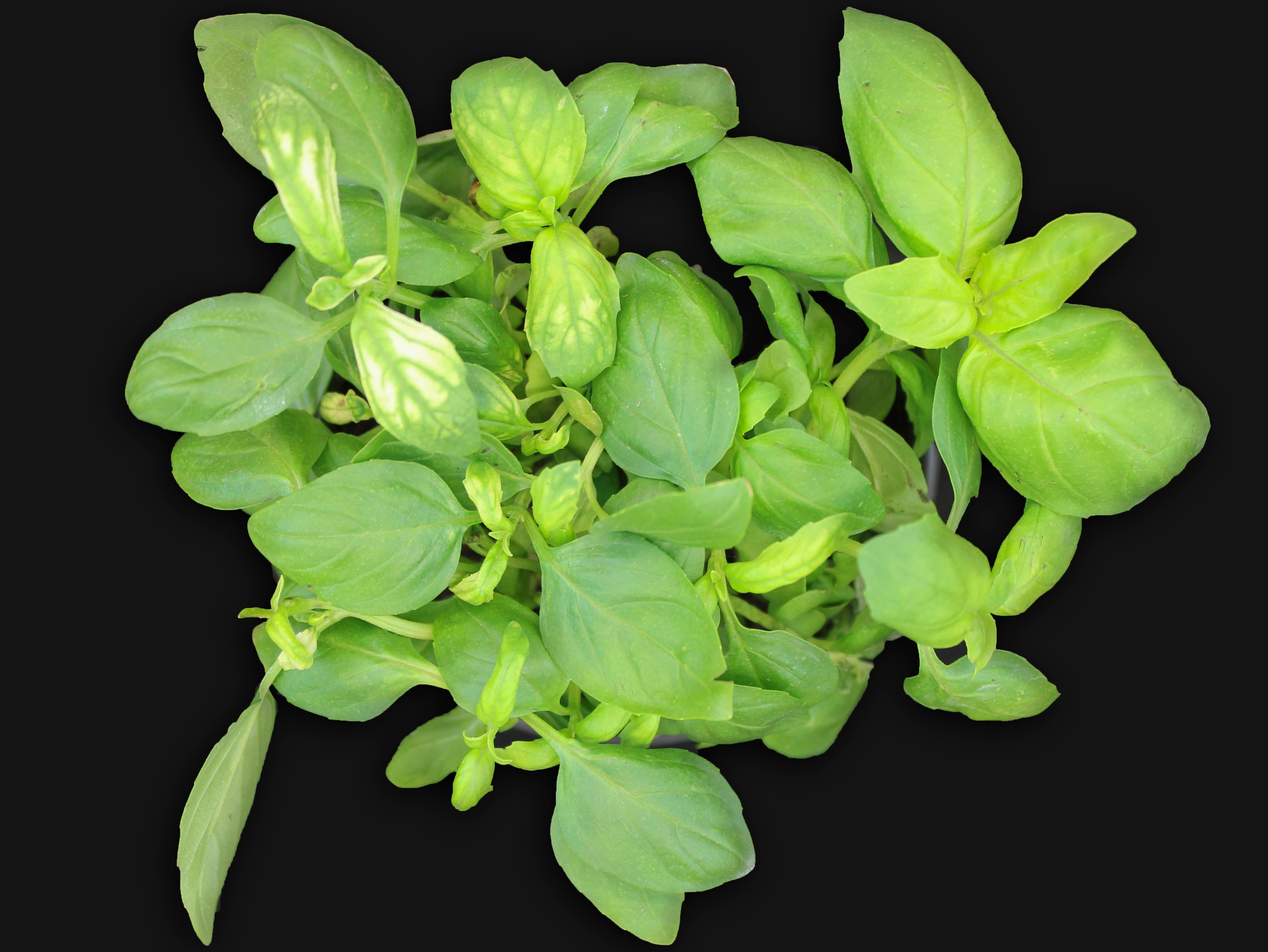 Description: Les feuilles opposées d'un plant de basilic présentent un jaunissement à blanchiment internervaire, débutant au bas du limbe en allant vers l’apex. Les nervures demeurent vertes. Les nouvelles feuilles sont jaunies. Les feuilles basales et médianes, le collet et les racines sont sans symptôme. Au champ, les plants affectés montrent un retard de croissance. C’est environ 10% de la plantation qui est atteint. Le dosage chimique réalisé a révélé la présence de glyphosate dans les tissus de la plante, en quantité amplement suffisante pour causer les symptômes observés. Cette phytotoxicité diagnostiquée serait le résultat d’un résidu de l’herbicide dans la cuve du pulvérisateur.