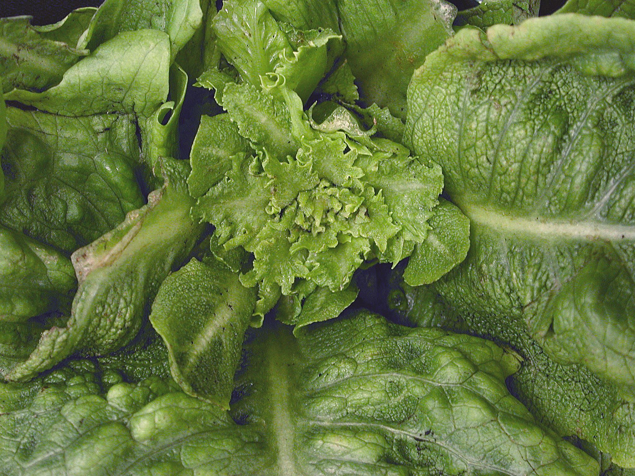 Description: Les feuilles terminales d'un plant de laitue de variété romaine présentent des malformations: celles-ci sont rabougries, atrophiées, dures et cassantes, et les tissus sont gaufrés. Il y a aussi présence de petits plants au niveau du collet (non visible ici). Les résultats des tests pour les virus sont négatifs. Le diagnostic conclut en une phytotoxicité causée par la dérive d'un herbicide phytohormonal (2,4-D ou MCPA). Dans le même champ, la laitue de variété Boston présente les mêmes symptômes.