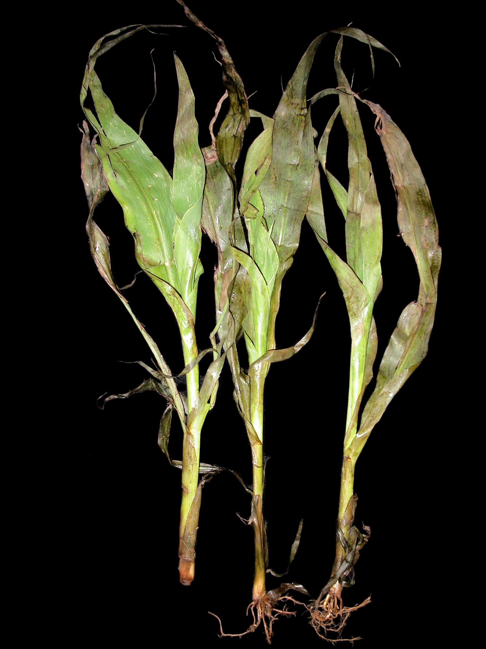 Légende: Plants de maïs sucré avec dessèchement et brûlures des feuilles