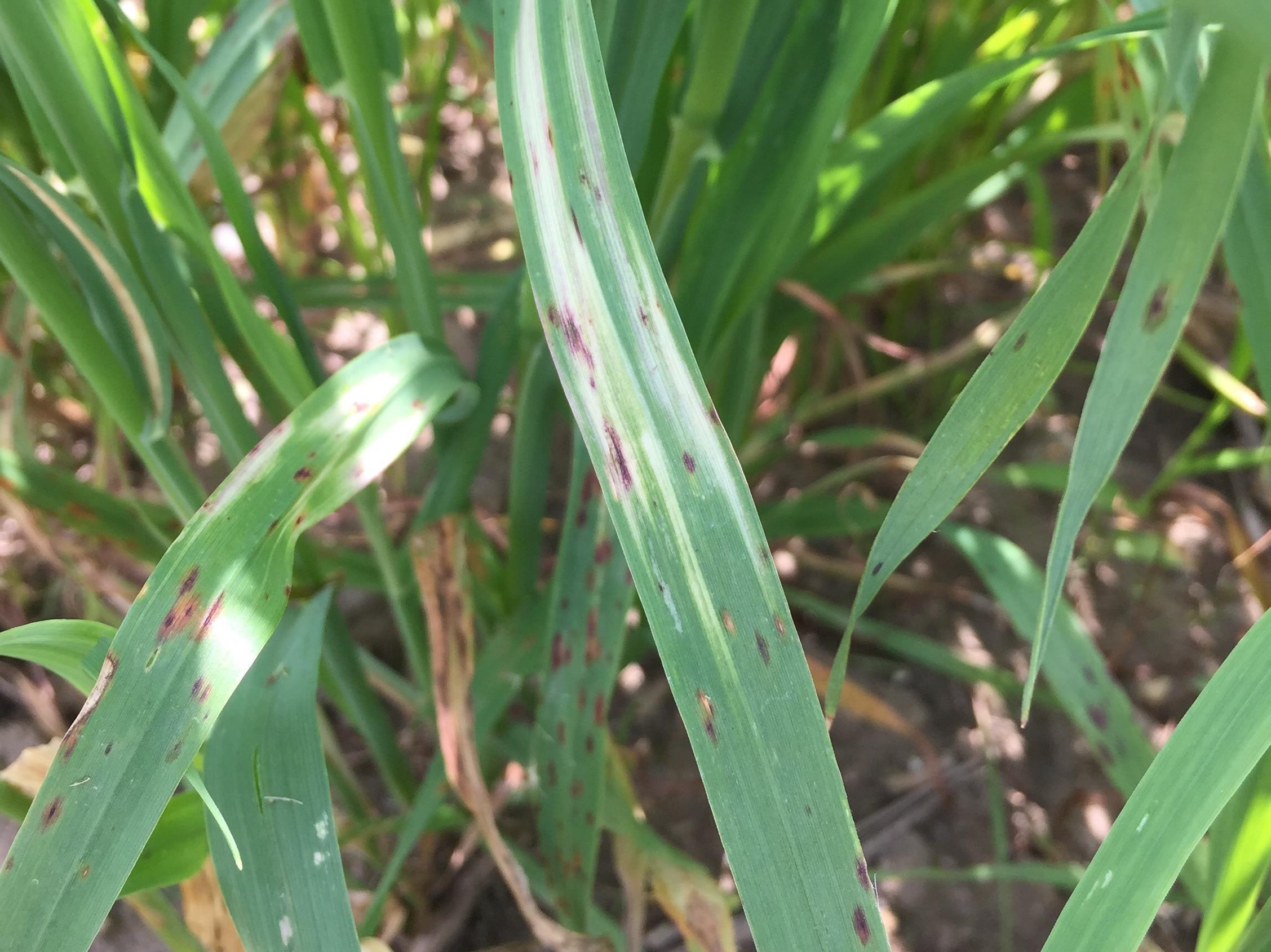 Description: Des feuilles d’avoine présentent des stries blanches (ou décolorées) ainsi que des taches allongées rose-violacées, réparties aléatoirement, de l’apex vers le centre du limbe. Une seule variété d’avoine présente ces symptômes, survenus près l’application de l’herbicide INFINITY (pyrasulfotole/bromoxynil (ester de)), non homologué dans l’avoine. Les symptômes observés seraient attribuables au pyrasulfotole, l'une des matières actives composant l'herbicide : la décoloration ou le blanchiment des tissus est un symptôme typique des herbicides du groupe 27. L’étiquette mentionne par ailleurs que les cultures subissant un stress causé par des conditions météorologiques défavorables, telles que survenu au moment de l’application de l’herbicide, peuvent être endommagées. De plus, certaines variétés de céréales sont davantage sensibles que d’autres à l’herbicide INFINITY.