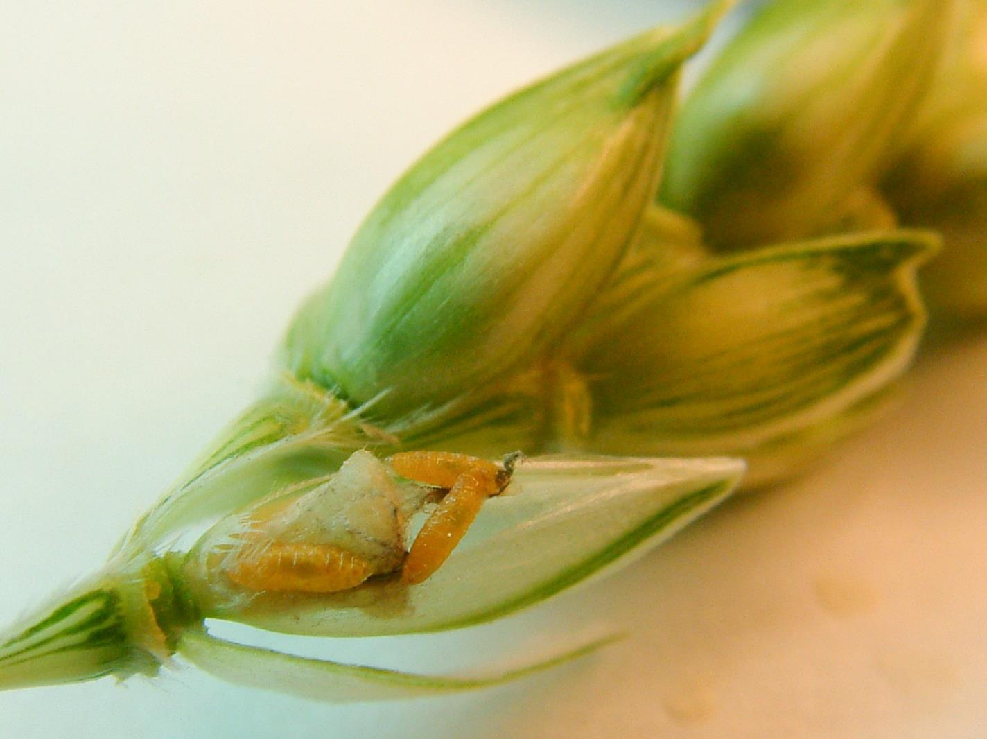 Description: Épi de blé infesté de cécidomyies orangées du blé : c’est au stade larvaire que la cécidomyie orangée du blé cause des dégâts sur le blé. Les dommages observés sont l’avortement floral, les grains déformés, la transmission des spores de Fusarium graminearum, l’altération de la qualité boulangère de la farine causée par les enzymes de la larve et la réduction de la dormance du grain provoquant une augmentation des risques de germination sur l’épi.