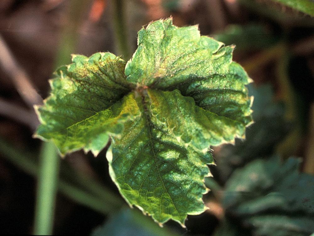 Description: Face supérieure d'une feuille de fraisier présentant des dommages causés par l'alimentation de tarsonèmes du fraisier. Ces acariens s'attaquent d'abord aux jeunes feuilles au coeur du plant. En plus d'induire un retard de croissance, les feuilles deviennent crispées, recroquevillées et d'aspect terne, jauni ou rougeâtre. Il en découle parfois un stress diminuant la productivité des plants ou augmentant leur sensibilité aux stress hydriques.