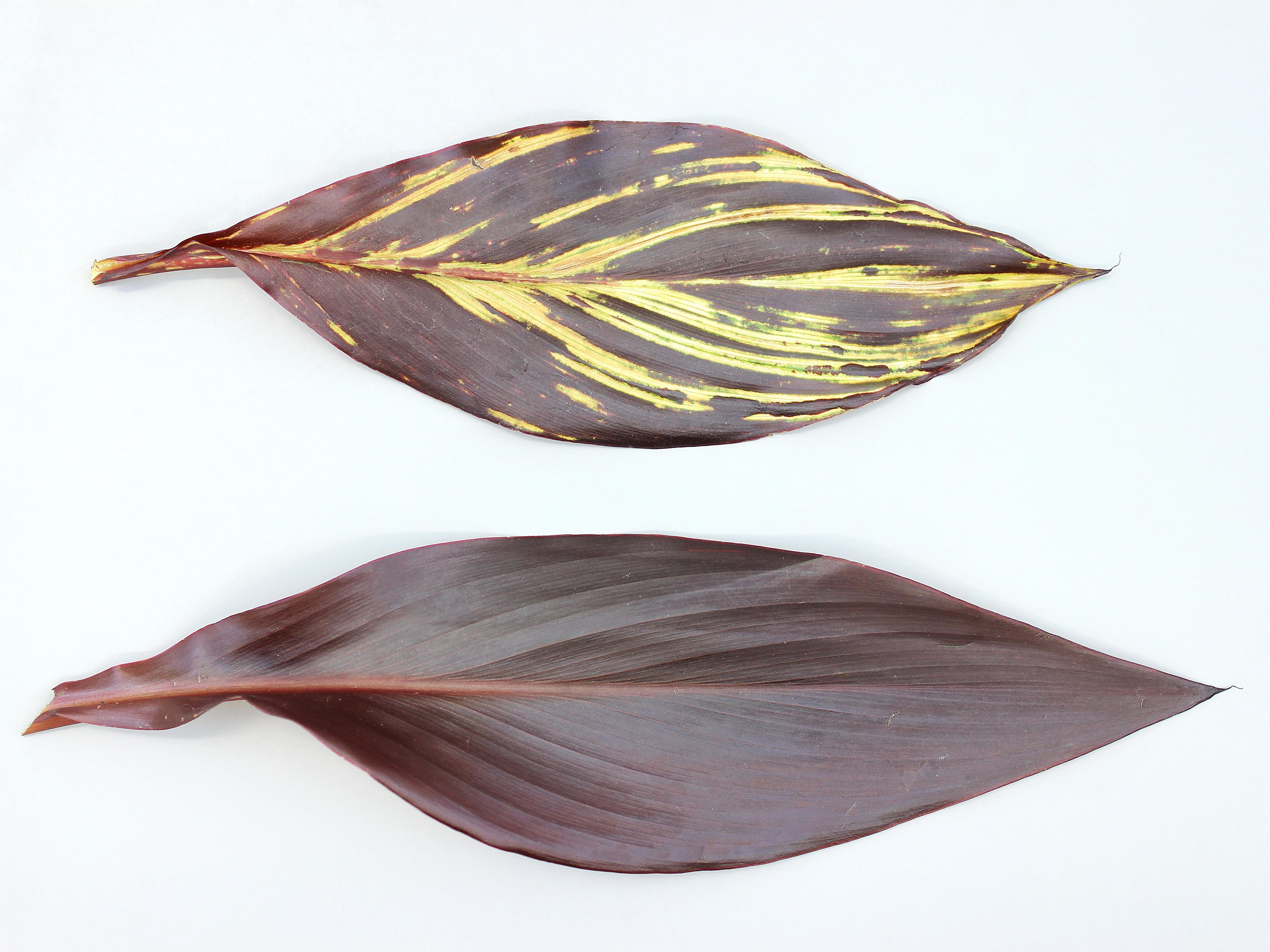 Légende: Comparaison entre une feuille de canna saine et affectée
