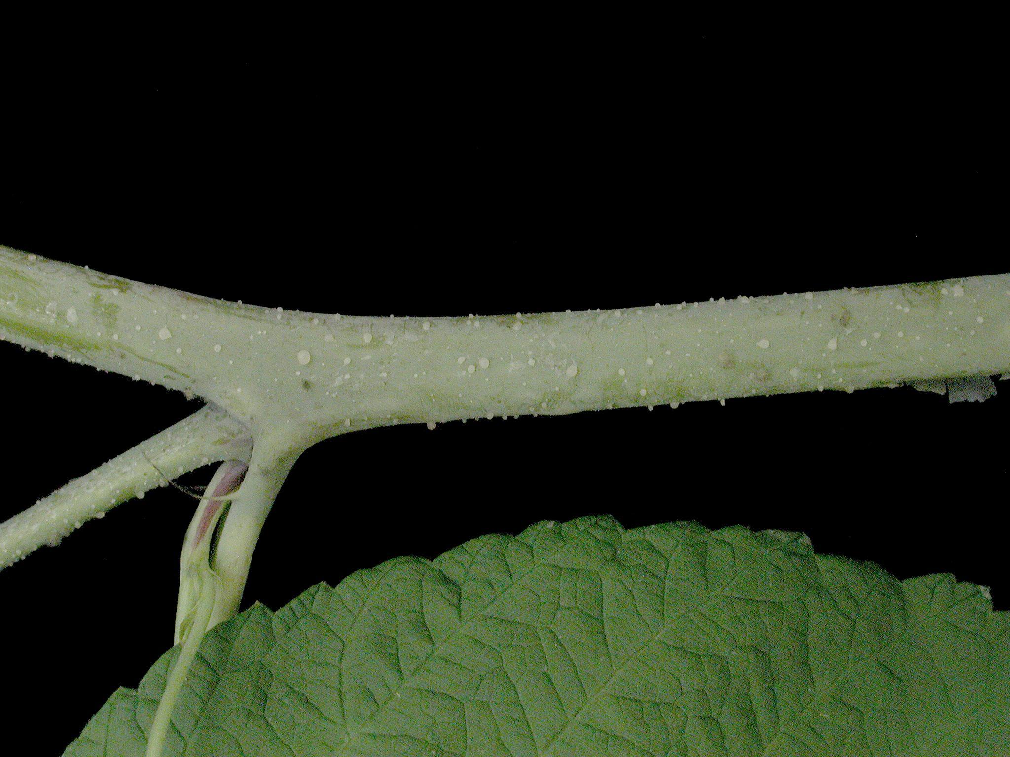 Description: Sur la tige annuelle d’un framboisier d’automne, présence de gouttelettes blanches et épaisses d'exsudats bactériens. Le test de laboratoire a révélé la présence de la bactérie Erwinia amylovora, responsable de la brûlure bactérienne (feu bactérien) chez le framboisier.