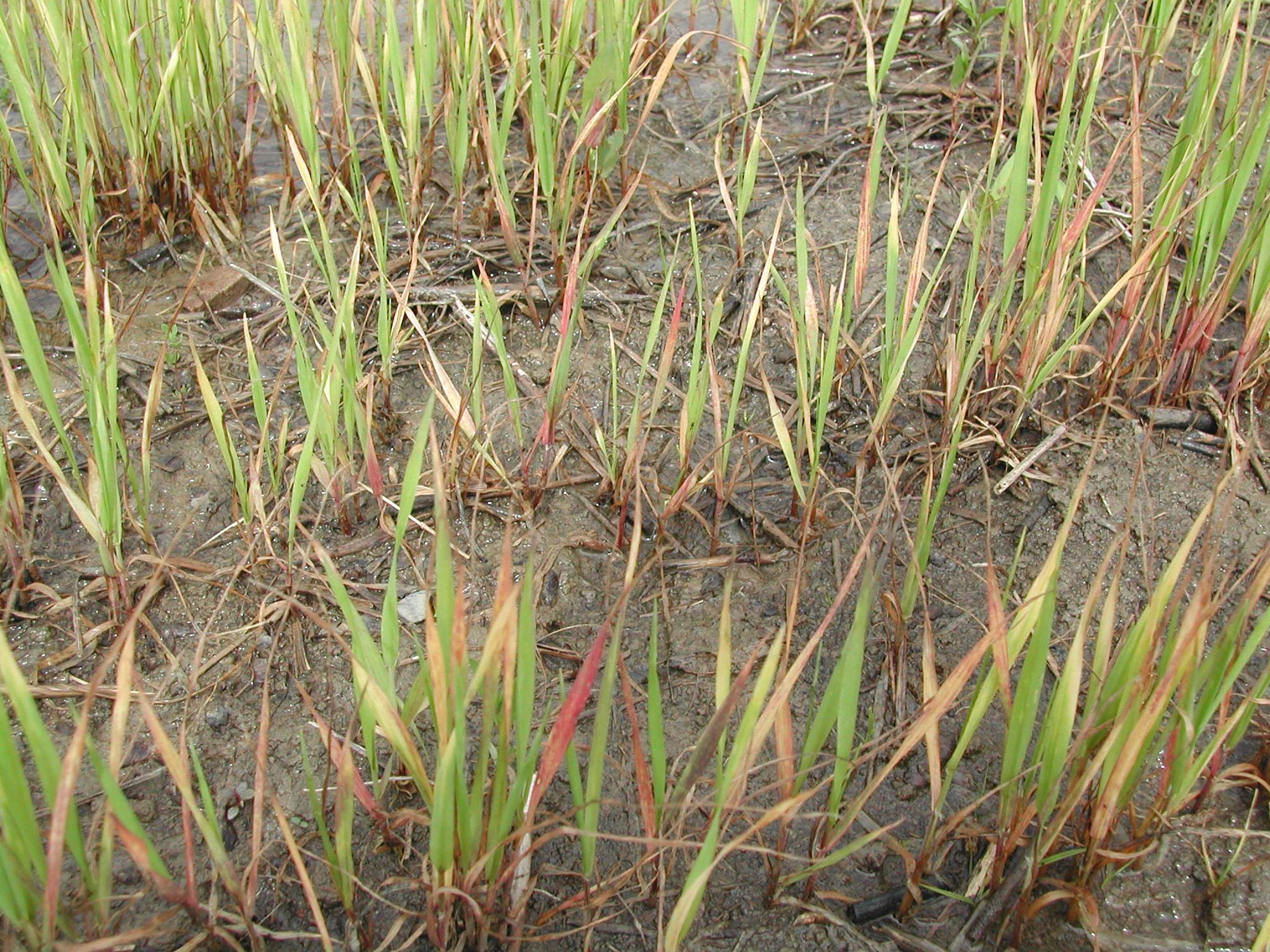 Description: Dans cette partie du champ, l’excès d’eau a causé un manque à la levée des plants de blé de printemps. Les plants germés sont vert pâle à jaunes et parfois rougeâtres et le tallage est presque inexistant. Cet excès d’eau est relié à un mauvais drainage du sol. Ces plants ont une croissance ralentie par rapport au reste du champ et ce retard de croissance peut être relié à une asphyxie racinaire.