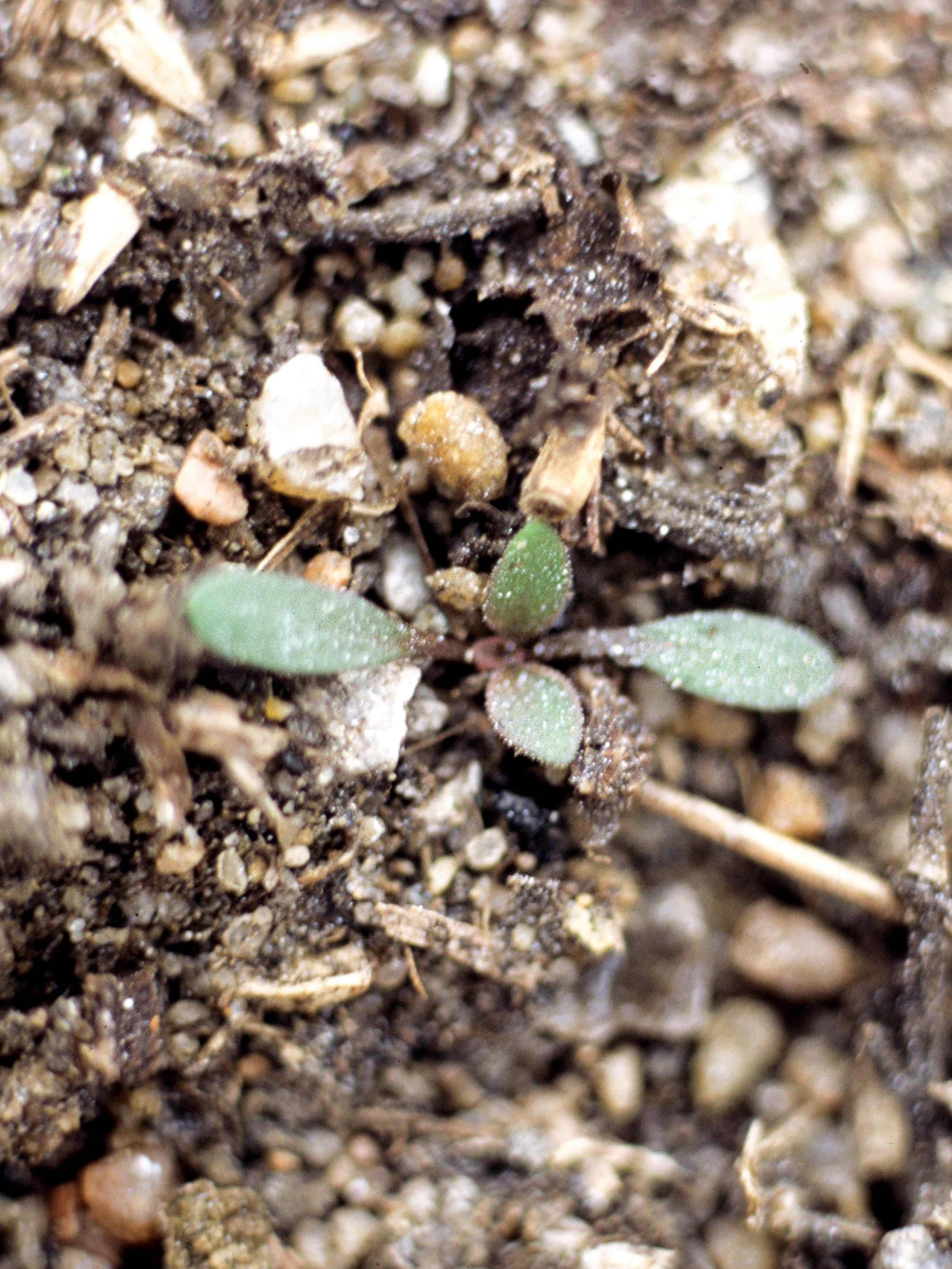 : Plantule, cotylédons vert foncé, allongés avec le sommet arrondi