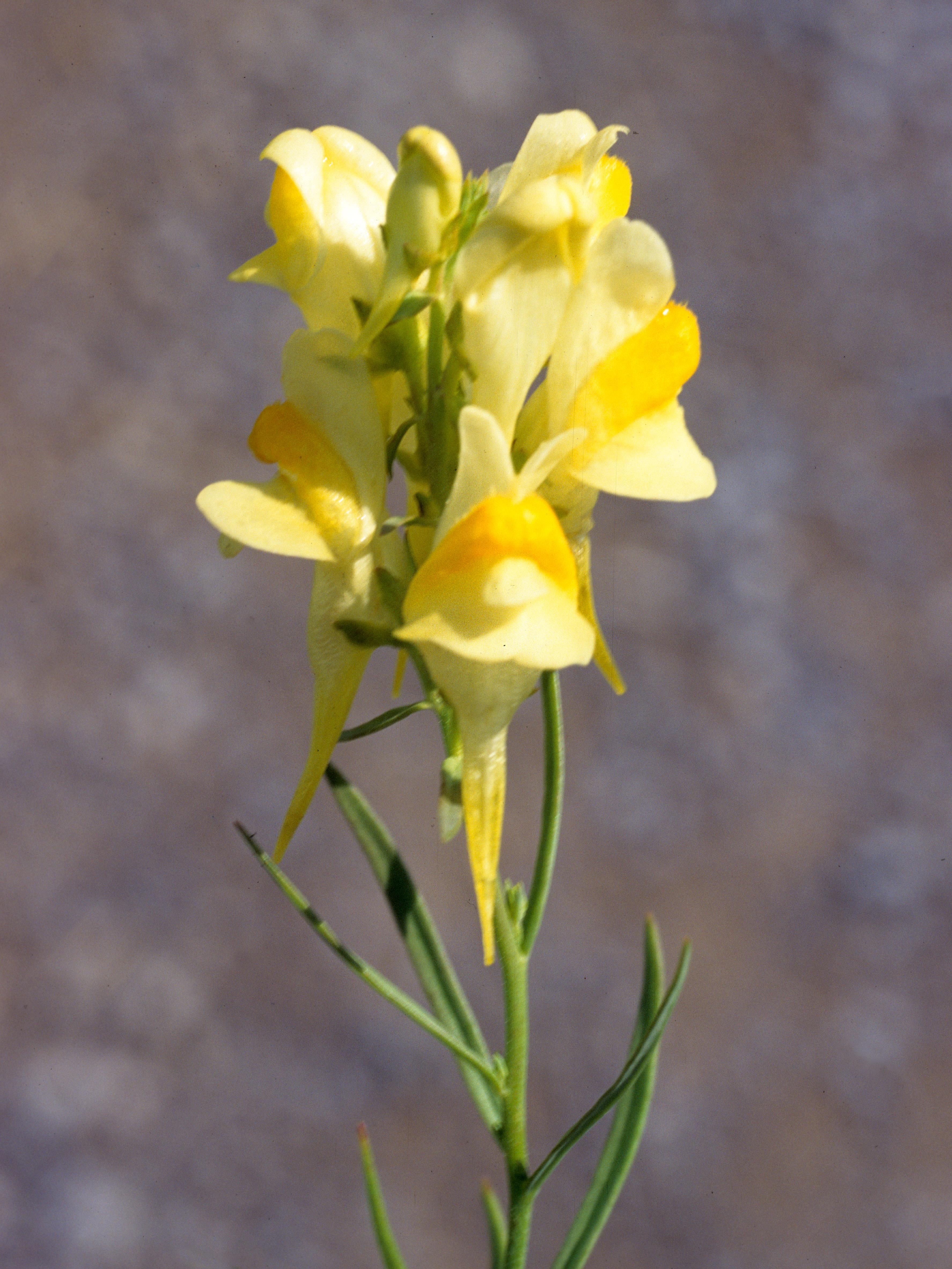 : Fleur jaune irrégulière, comporte une partie orangée (lèvre) et est prolongée par un long éperon