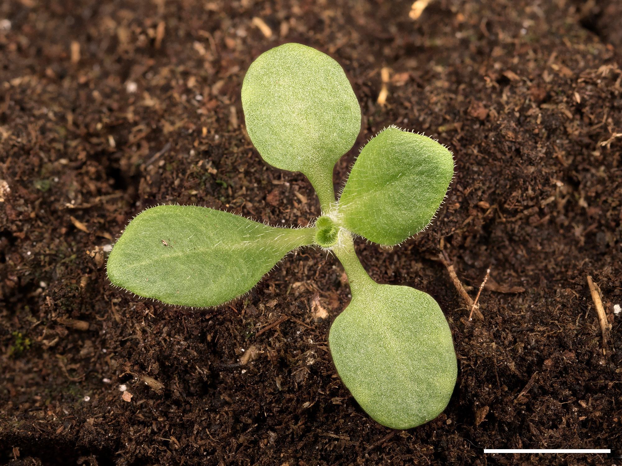 : Premières feuilles arrondies à ovales, le trait horizontal = 1 cm