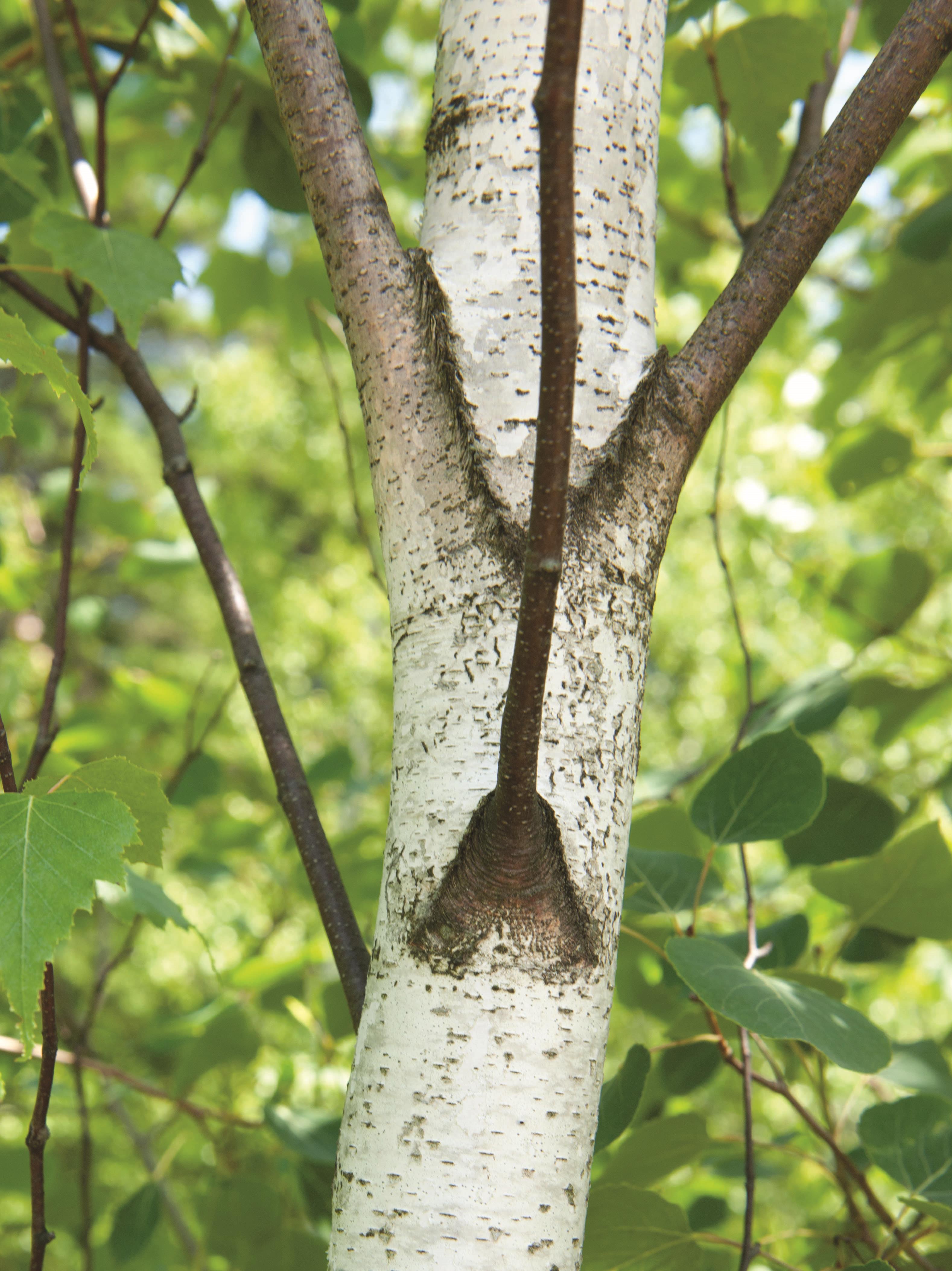 : Tronc, écorce avec des taches noires triangulaires à l'aisselle des branches
