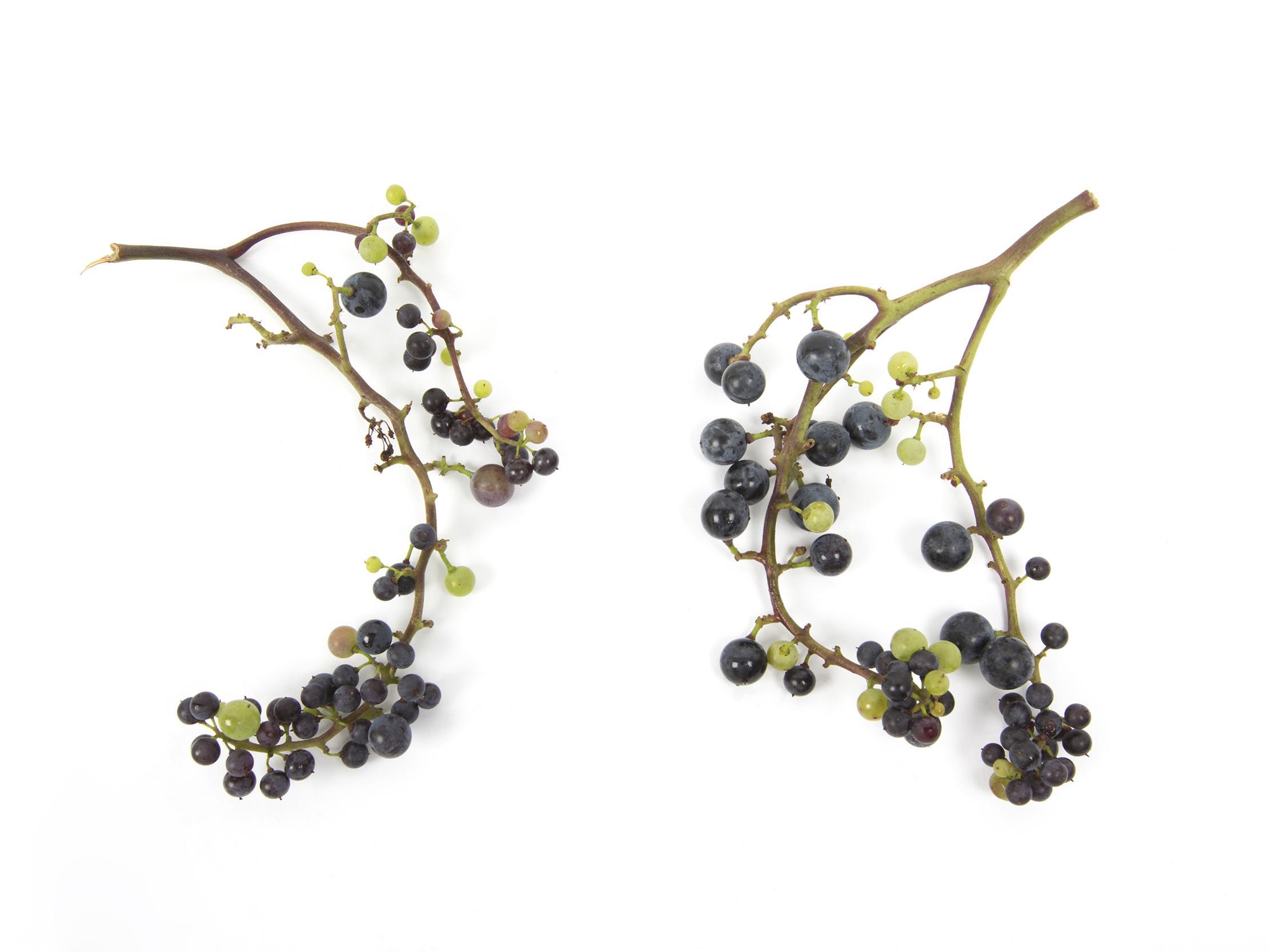 Légende: Maturité inégale des fruits sur des grappes de vigne (cépage Frontenac).