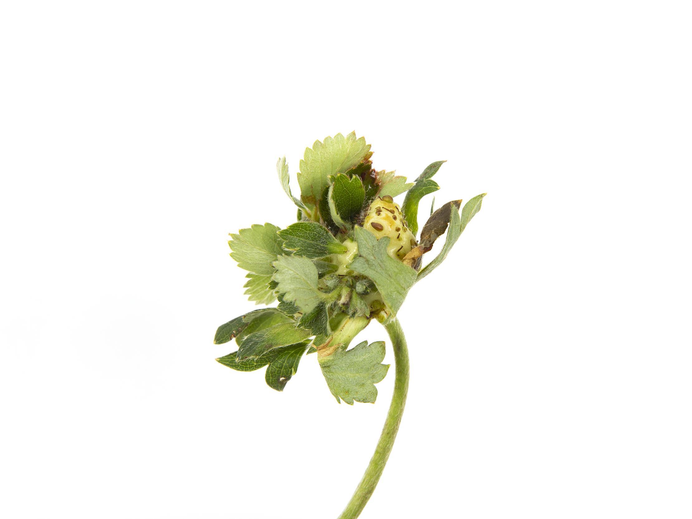 Description: La fraise (cv 'Malwina') est déformée et l’on observe une croissance foliacée à partir des akènes du fruit. Ces malformations sont des symptômes caractéristiques du phytoplasme de la jaunisse de l’aster chez le fraisier. Les tests en laboratoire ont révélé la présence d’un phytoplasme dans cet échantillon.