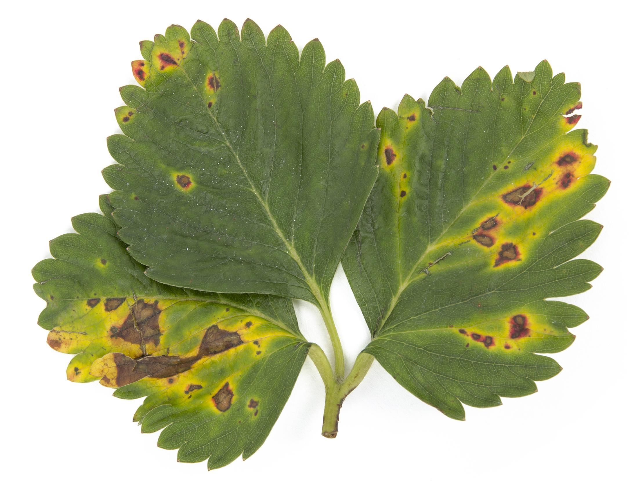 Description: Sur une feuille de fraisier, présence de taches brunes de forme irrégulière, avec pour la plupart un contour rose violacé et un halo jaune. Les tests de laboratoire ont révélé la présence de Zythia sp., responsable de la tache zythienne chez le fraisier.
