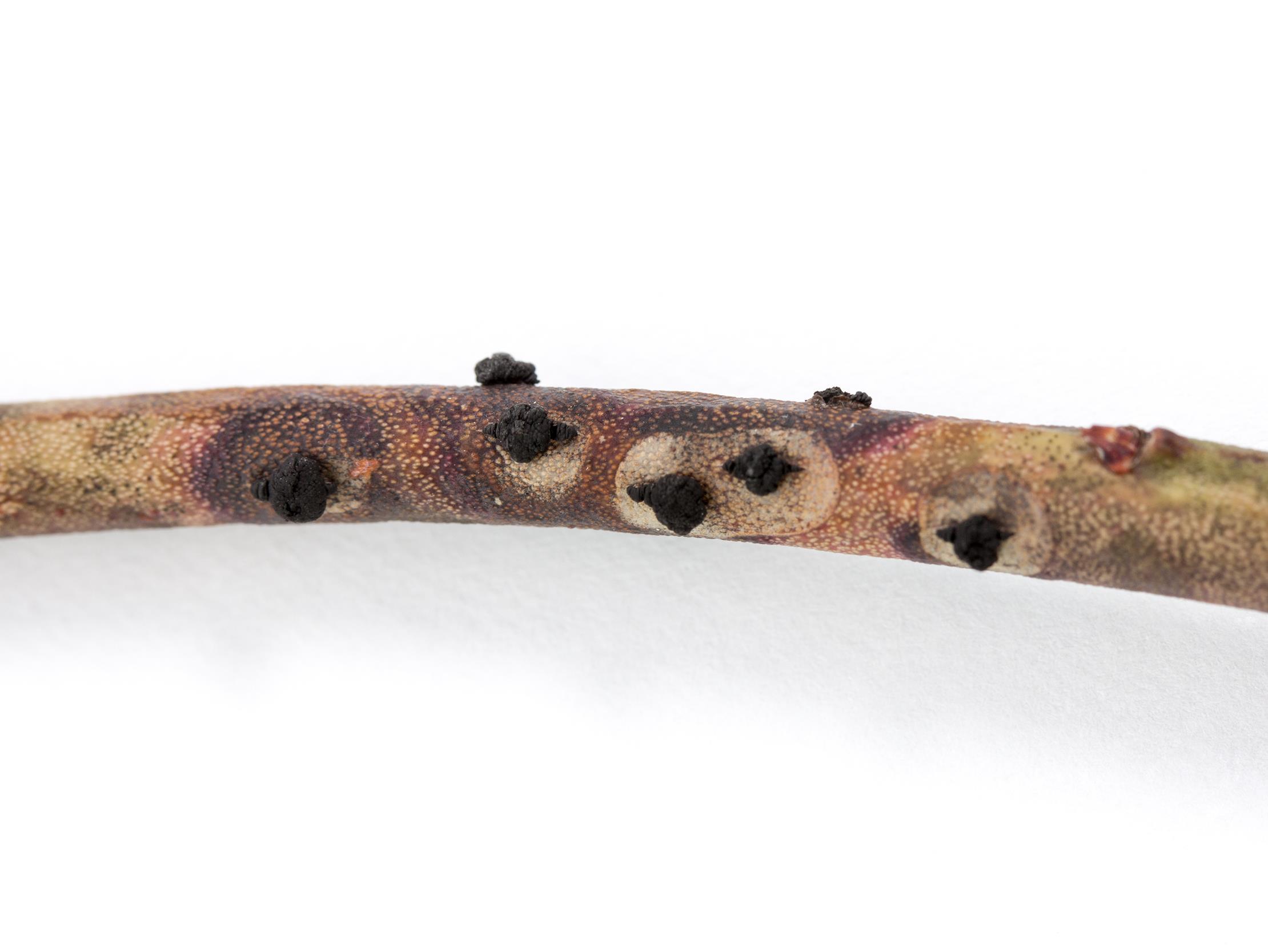 Légende: Masses noires (pseudothèces) sur une tige de bleuet en corymbe