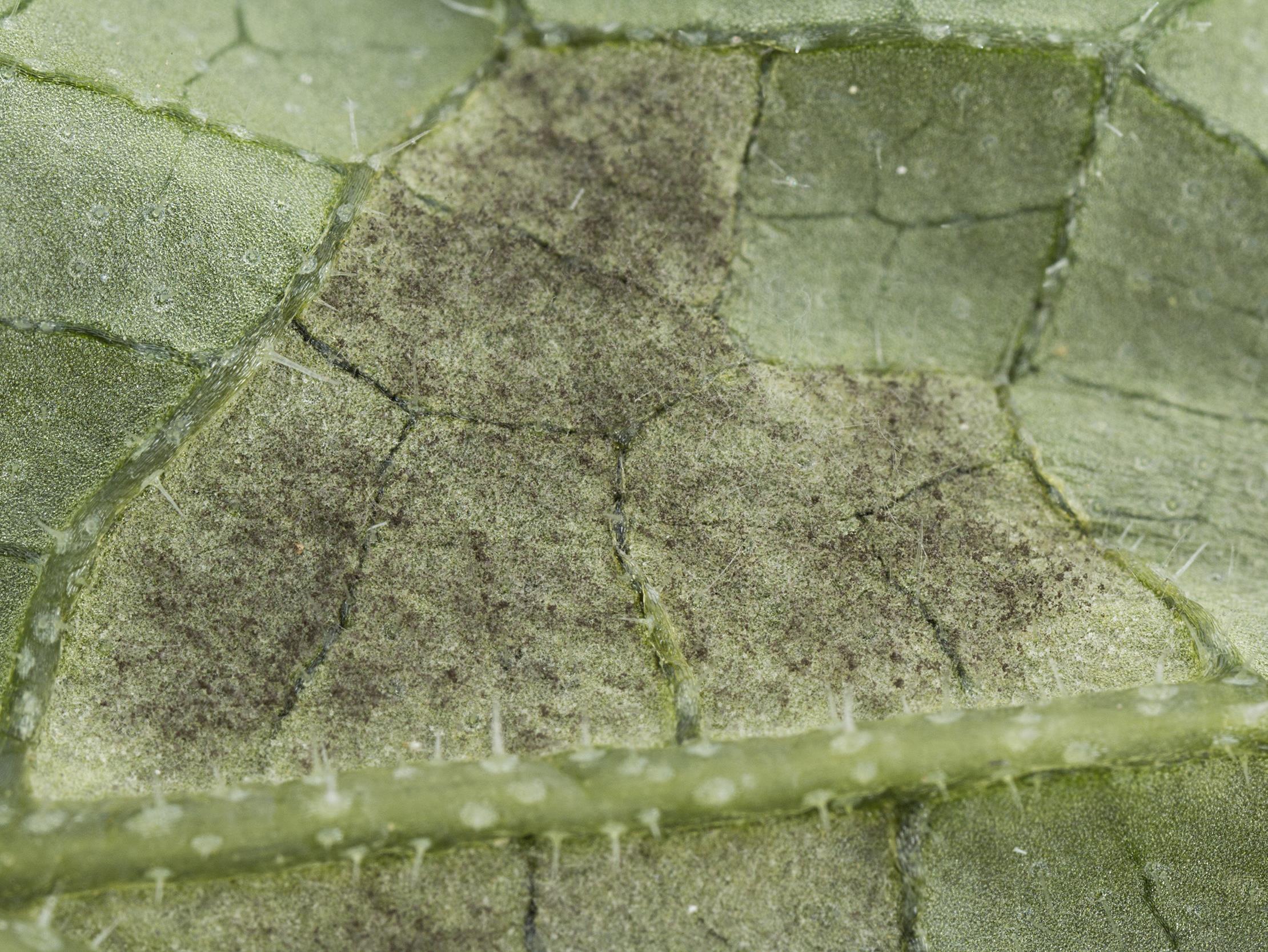 Légende: Duvet gris correspondant aux structures fongiques de Pseudoeronospora cubensis sur la face inférieure d'une feuille de concombre.