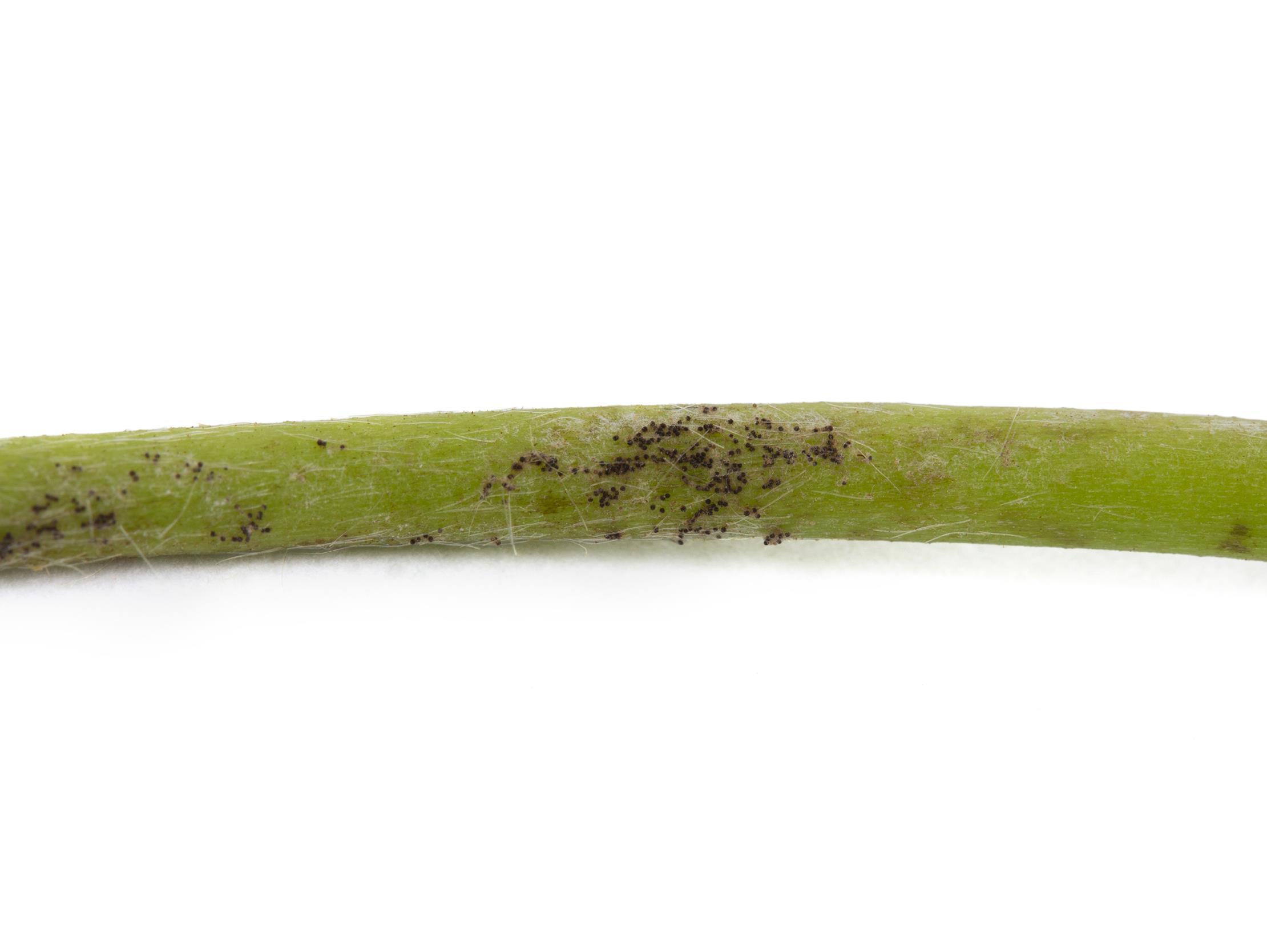 Description: Ce pédoncule de fraise est recouvert d’un fin duvet blanc (mycélium) et de petites structures fongiques noires nommées cléistothèces. Ces structures sphériques apparaissent généralement en fin de saison. Dans ce cas-ci, elles se sont développées en entrepôt. Elles se forment à partir du mycélium (duvet blanc) du champignon et constituent une forme de conservation hivernale du champignon. Les tests de séquençage ont permis d’identifier la présence du champignon Podosphaera aphanis, responsable du blanc (oïdium) chez la fraise.